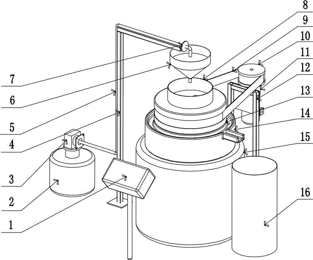 本实用新型公开了一种石磨法涂料镀膜分散机,包括磨盘底座和依次固定安装在磨盘底座上方的下磨盘与上磨盘,下磨盘具有一个出料口,出料口与收料桶相对应,用于接收涂料。电机固定在电机支架上,所述皮带轮固定在电机的输出轴上,皮带轮通过传动皮带与上磨盘连接在一起;电机带动上磨盘旋转,使浆料在上磨盘与下磨盘之间分散镀膜;下磨盘与上磨盘呈相互平行设置、并且呈逐层垒叠放置。本实用新型主要用于建筑用保温隔热涂料的制备,能让涂料在制备过程中搅拌更充分,从而可使料桶内的涂料在上下方向和水平方向上都能被快速分散,大大提高了整体的分散效果。