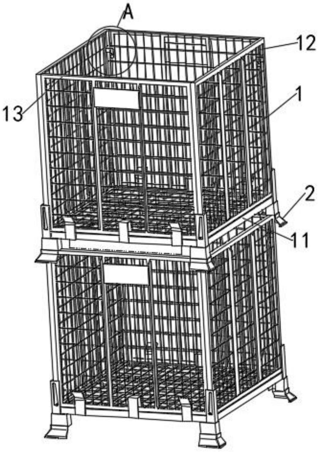 本实用新型公开了一种装料铁笼结构,包括铁笼以及设置在铁笼底部四个边角上的四个相同底脚,底脚包括固定在铁笼底部的支撑折板以及固设在支撑折板外侧壁上且延伸至支撑折板下方的固定折板,固定折板位于铁笼周壁外侧,固定折板底部设有沿顶端至底端向外倾斜的扩径斜折板,固定折板与扩径斜折板之间圆滑过渡,降低铁笼的堆叠难度,使铁笼可在上下对准后直接进行垂直堆叠,无需考虑铁笼变形对堆叠的影响,大大提高使用机器自动堆叠的成功率。
