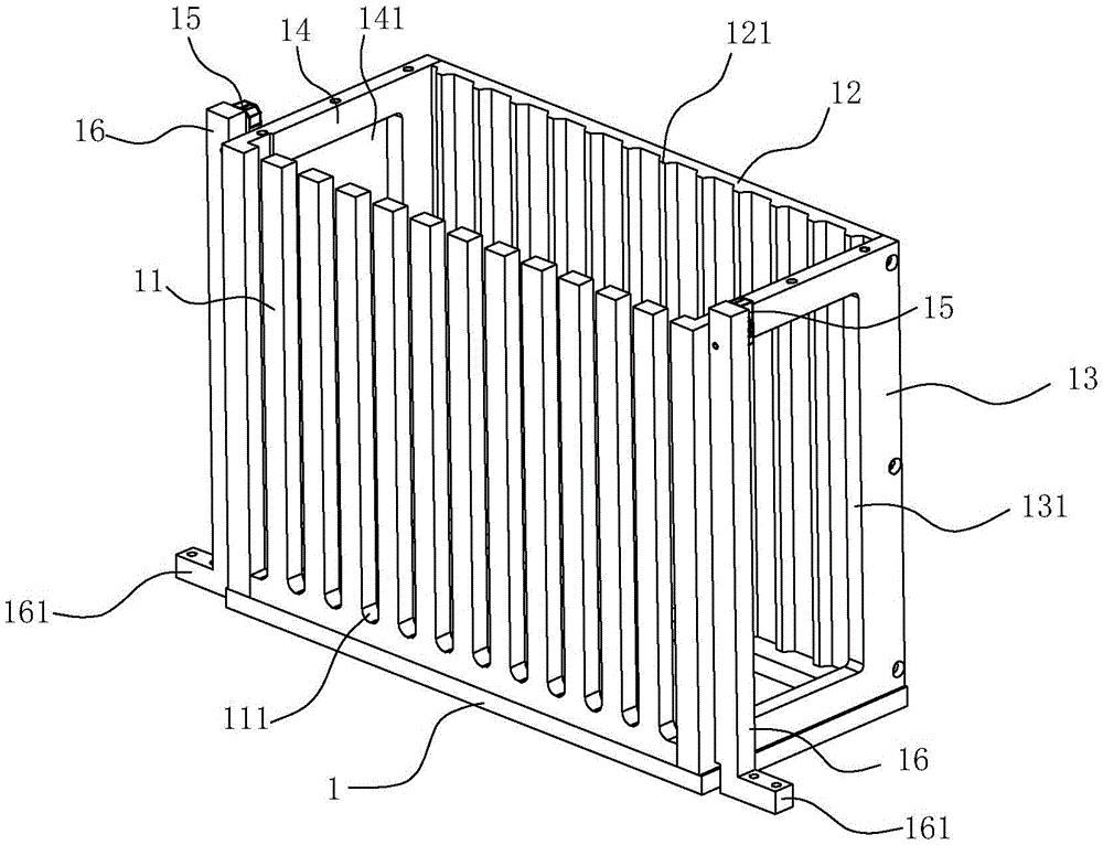 本实用新型涉及一种梳体暂存盒,包括盒体,其特征在于:所述盒体顶部敞开布置,所述盒体的第一侧壁上开设有自上而下延伸的供梳柄伸出的开口,该开口的上端敞开布置,所述盒体第二侧壁的内壁面上设有用于对梳体的头部进行限位的限位条,所述第二侧壁与第一侧壁相对布置,所述限位条在盒体的第二侧壁上竖向延伸并与开口相对应,所述梳体置于盒体中状态下,所述梳体头部的端口穿过限位条布置,所述梳体尾部的梳柄穿过开口伸出盒体外。本实用新型便于将梳体同向按顺序排放,便于自动夹爪完成自动夹取工作,有利于避免因方向错位而导致植针错位或出错,提高产品合格率及生产效率。