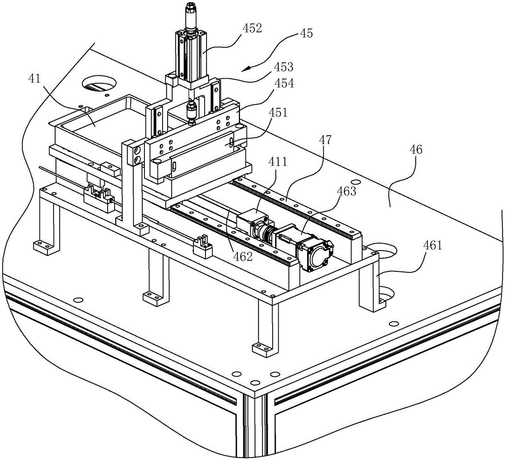 本实用新型涉及一种梳针自动染头机的墨盒机构,包括操作平台及墨盒,墨盒设于操作平台上,还包括头油刮平机构,头油刮平机构设于墨盘上方并具有能相对于墨盘长度方向来回移动从而将墨盘中的头油刮平的刮板,操作平台上设置有操作平台,操作平台上设置有沿墨盘长度方向布置的第二滑轨,墨盘能来回移动地设于该第二滑轨上,刮板支撑于第二滑轨两侧并位于墨盘上方,墨盘上方设置有能驱动刮板上下移动的第七气缸。墨盒与刮板之间通过相对移动从而将头油刮平,且是通过墨盒的主动移动来实现的,相比于刮板主动移动来说,墨盒主动移动有利于墨盒中的头油在移动过程中因晃动而发生一定的流动,有利于使头油更加均匀的分布,从而提高圆头的大小一致性。