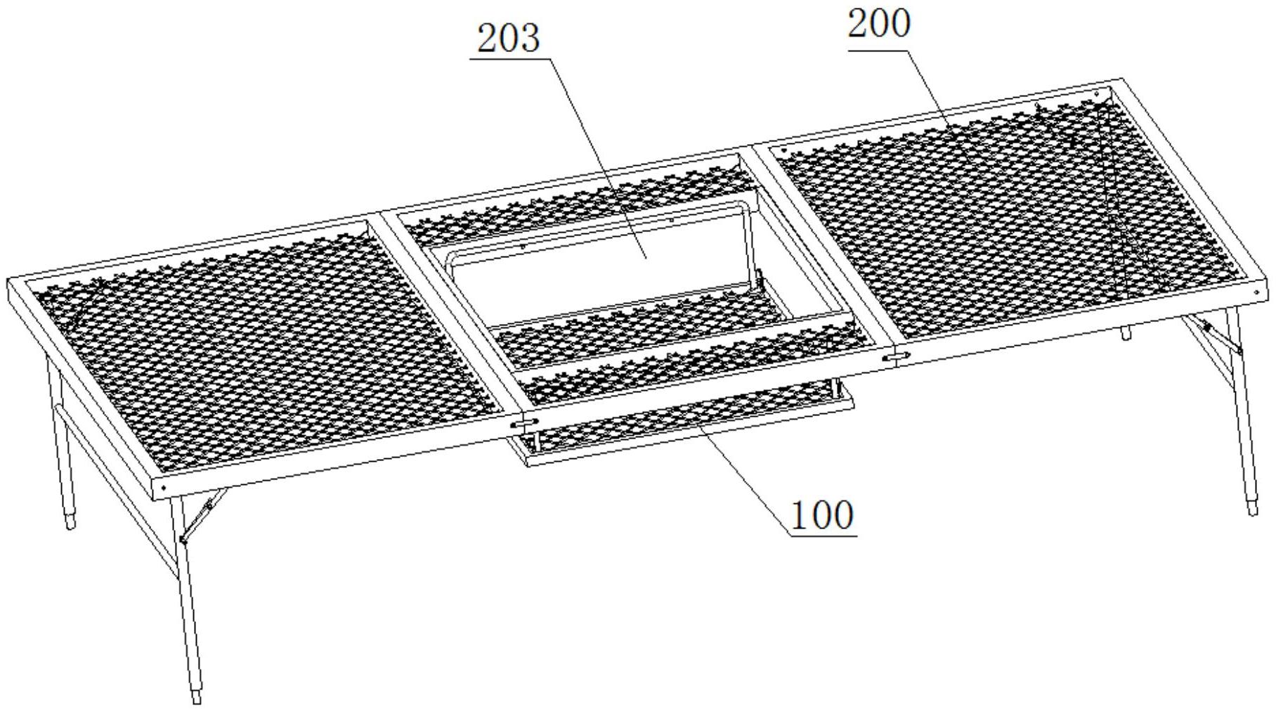 本实用新型涉及桌子技术领域,尤其是涉及一种烧烤桌。包括第一桌体和第二桌体,所述第一桌体包括第一桌面和第一桌腿,所述第二桌体包括第二桌面和第二桌腿;所述第二桌面上设置有用于容纳所述第一桌面的中空结构;所述第二桌面上还设置有用于支撑所述第一桌面和/或所述第一桌腿的支撑件。本实用新型解决了现有技术中功能单一的技术问题。