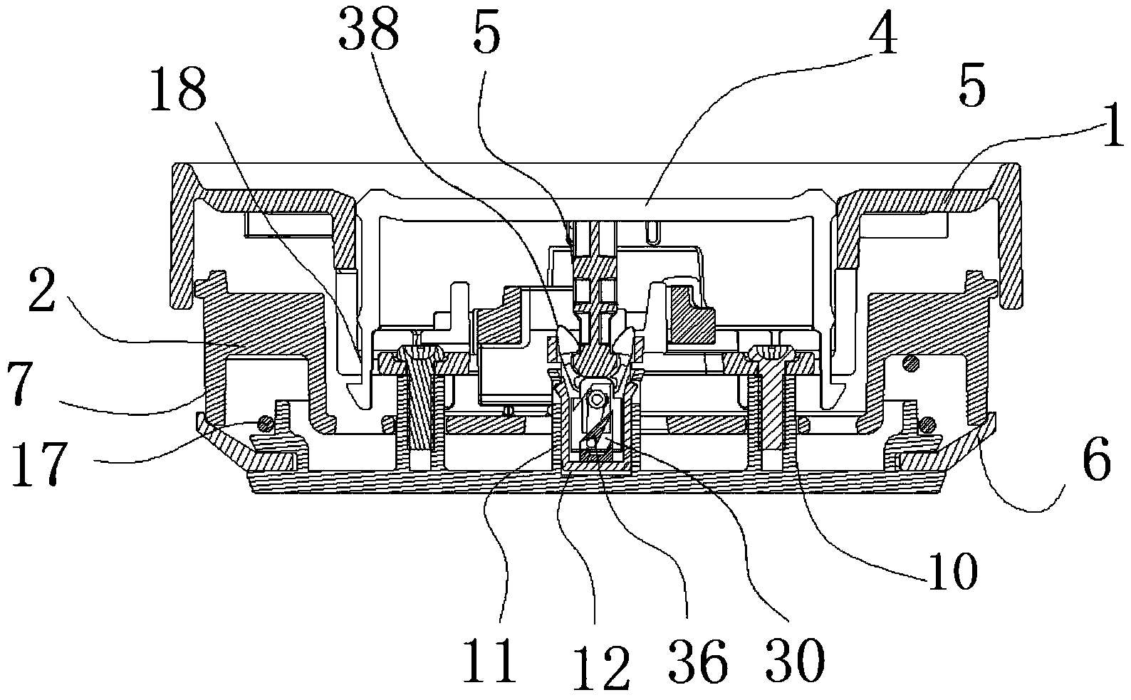 本实用新型涉及储物器具技术领域,且公开了一种储物罐盖的密封结构,包括盖体组件,盖体组件包括上盖、中盖和下盖,上盖和下盖固定连接,中盖活动设置在上盖和下盖之间,上盖的中部设置有第一安装槽,第一安装槽的内部卡接有按钮,按钮的下方固定连接有扣头,下盖上设置有与扣头相对应的开关机构,下盖的周向卡接有碗状的密封圈,碗状的密封圈开口向上,中盖的底部固定连接有抵紧环,抵紧环的底端与密封圈的顶部内壁相对应,中盖和下盖之间设置有弹性支撑机构,第一安装槽的底部铰接有顶升机构。本实用新型可以通过按压按钮的方式实现对罐体的密封和密封的解除,操作方式简单,密封效果良好。