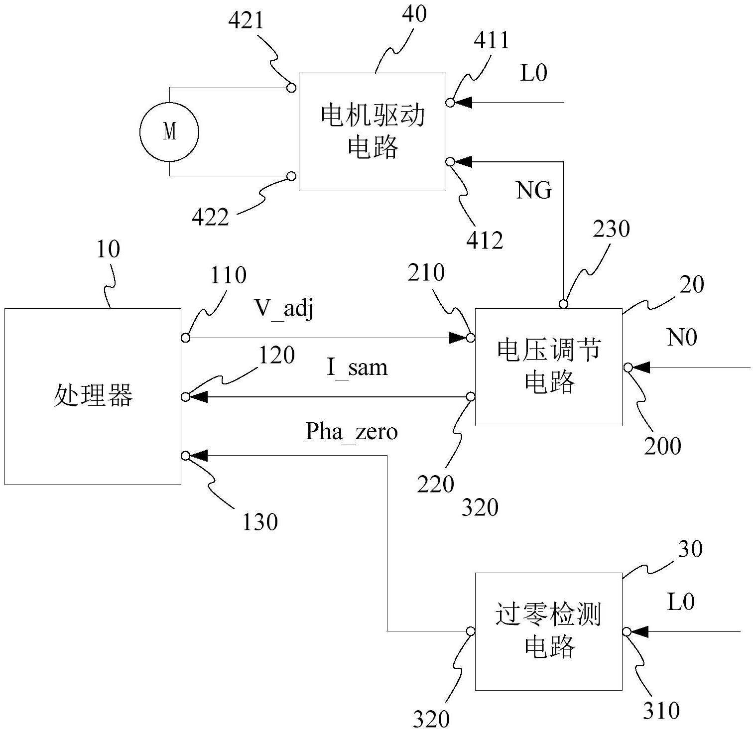 本实用新型提供了一种电机的驱动装置,包括:处理器;电压调节电路,所述电压调节电路响应于所述处理器产生的调压信号,产生以外接零线为基准的受控可变电压,并且,所述电压调节电路产生用于所述处理器确定所述调压信号的采样电流;过零检测电路,所述过零检测电路利用对外部火线的单线检测,向所述处理器输出相位采样信号;电机驱动电路,所述电机驱动电路以所述受控可变电压为零线参考电压,利用外部火线提供的交流电压产生对电机的供电电压。基于该驱动装置,电机的供电电压能够随受控可变电压而被调节,从而可以支持电机功率的可调节。
