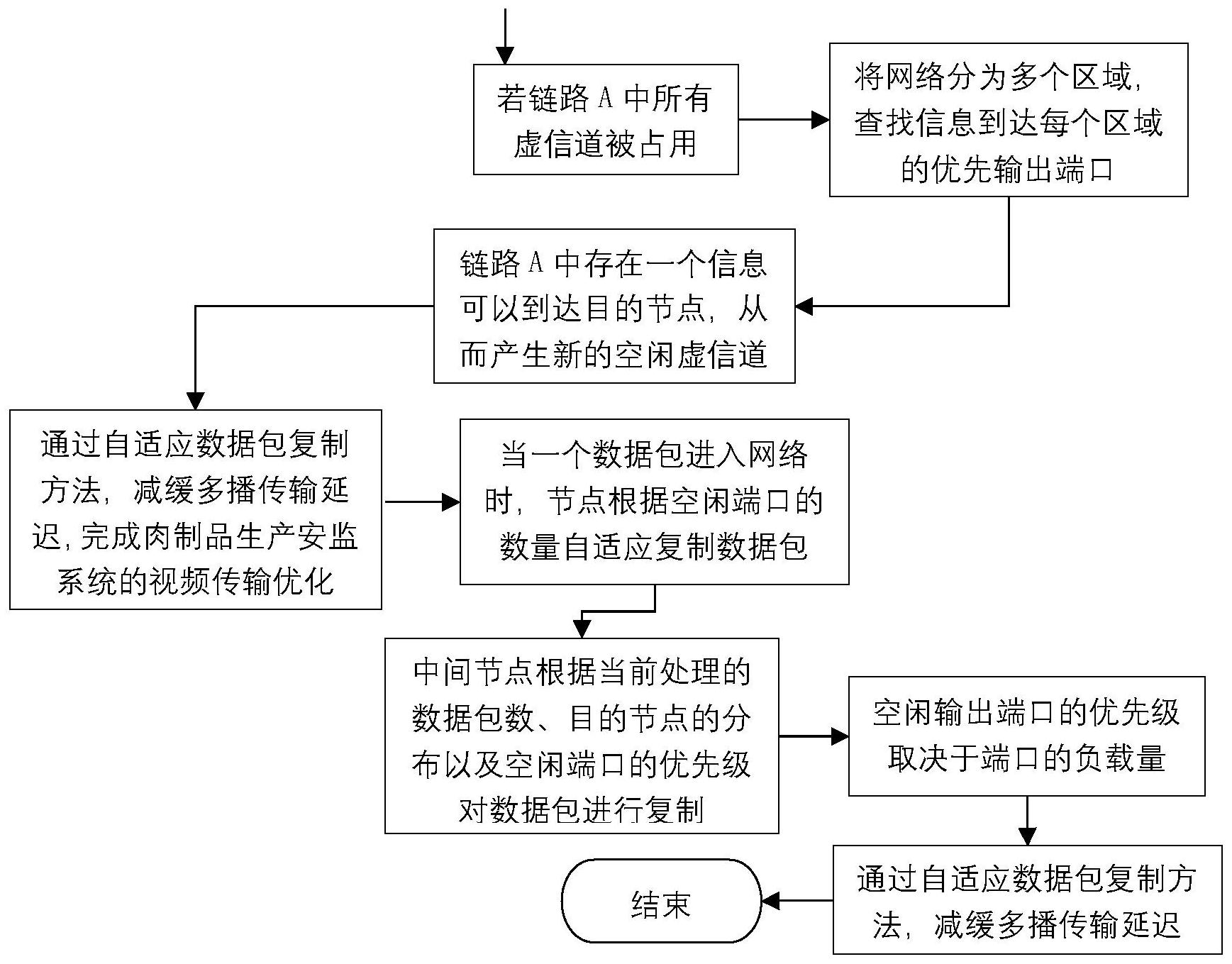 本发明公开了一种肉制品生产安监系统视频传输优化方法。主要包括:A.根据肉制品生产安监系统视频传输网络中的源节点和目的节点分别选取核心节点;B.通过对核心节点执行逆向路径转发检查,设置上游节点和下游节点,构造多核多播共享树;C.通过给多播包分配虚信道保留切片缓存区,提高多播路由完全自适应性能,防止发生死锁现象;D.通过自适应数据包复制方法,减缓多播传输延迟,完成肉制品生产安监系统的视频传输优化。该方法具有较强的可扩展性和容错性,有效地利用了网络的缓冲资源,提高网络性能,减少网络开销,避免网络拥塞甚至死锁的发生,提供视频的传输质量。