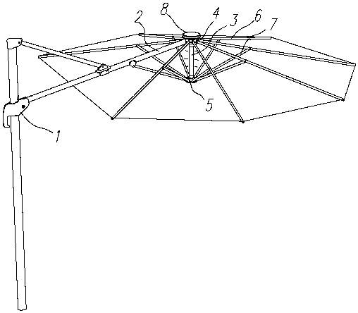 本实用新型公开了太阳能发光吊伞,包括摇手装置、吊杆以及伞盘管,所述伞盘管的顶端设有上伞盘,底端设有下伞盘;所述上伞盘上铰接有长伞骨,下伞盘上铰接有短伞骨,短伞骨的另一端与长伞骨铰接;所述吊杆的一端与摇手装置连接,中部铰接有短伞骨,所述上伞盘的上方设有电源控制装置,所述伞盘管为透光材质,伞盘管内设有光源,所述光源与电源控制装置电连接。具有以下优点:整体结构合理,结构简单,操作方便,将伞盘管设置成透光材质,可以有效的将光源反射出来,起到点亮周围环境的效果,功能更加多样化。