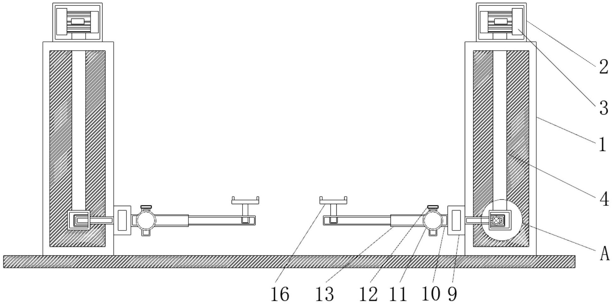 本实用新型公开了一种维修汽车底盘的提升装置,包括提升装置本体,所述提升装置本体的顶端固定连接有液压箱,且液压箱的内部设置有液压缸,所述液压缸的输出端配合连接有液压杆,且液压杆的底端配合连接有第一连接块,所述第一连接块的左侧表面开设有第一卡槽,且第一卡槽的内部配合连接有第一卡块,所述第一卡块的左侧配合连接有固定板,且固定板的左侧配合连接有第二连接块,所述第二连接块的左侧配合连接有转轴,且转轴的左侧配合连接有伸缩杆。本实用新型通过设置有第一卡块和第一固定块,在提升装置本体的使用过程中,通过设置的第一卡块卡合在第一连接块的内部,在通过设置的第一固定块进行固定,提高了装置的稳定性。