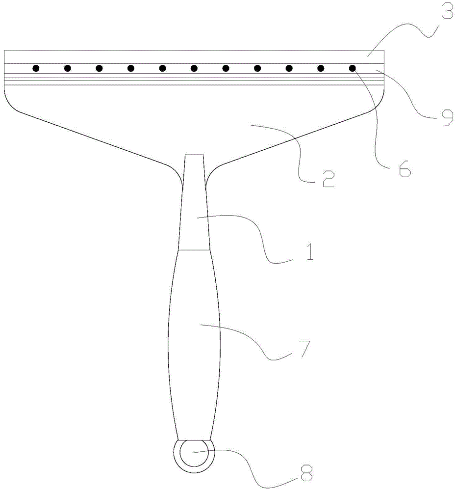 本实用新型提供一种玻璃刮水器,包括手柄、支架及刮条,所述手柄与所述支架的一侧连接,所述支架的另一侧具有供刮条嵌入的凹槽,所述凹槽的两侧板内壁通过胶水与嵌入所述凹槽的刮条固定连接,在所述凹槽的两侧板上开有多个通孔,胶水嵌入所述通孔内,形成突出点。采用本实用新型提供的玻璃刮水器,采用凹槽的两侧板内壁通过胶水与嵌入凹槽的刮条固定连接,胶水嵌入凹槽的两侧板的通孔内,形成突出点,突出点与通孔之间嵌合牢固,增加了刮条与凹槽的两侧板内壁之间连接的牢固性,刮条不容易脱落。