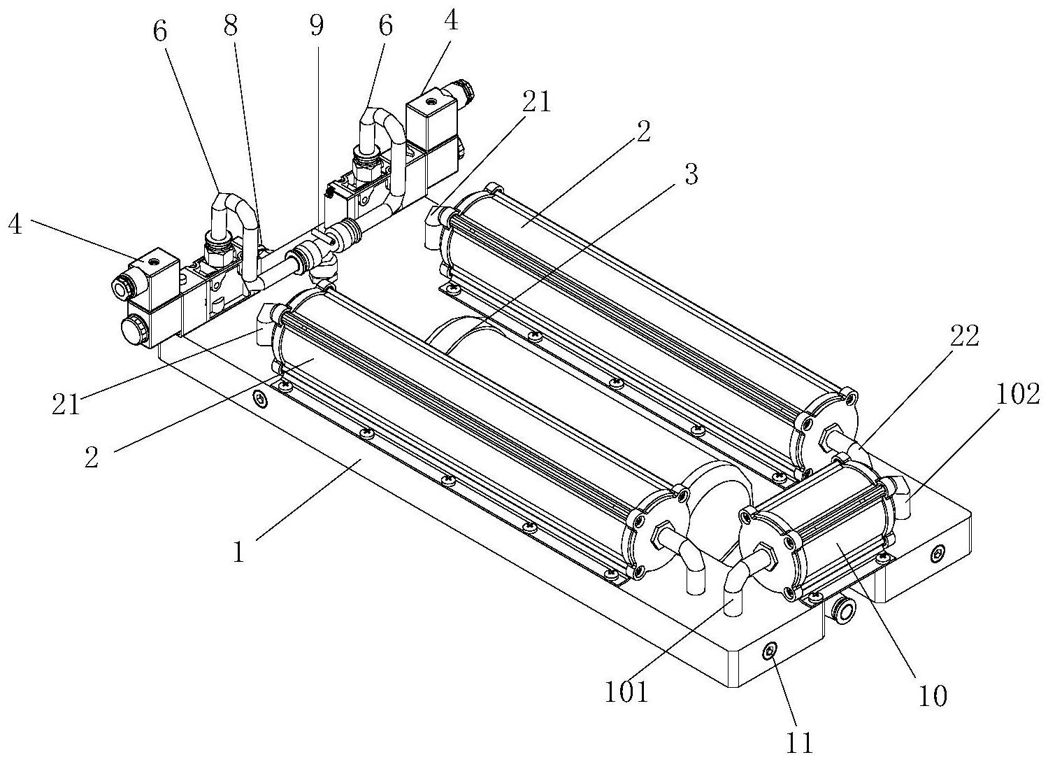 本实用新型提供一种制氧机板式集成吸附塔模组。所述制氧机板式集成吸附塔模组包括吸附塔、氧气缓冲罐、阀板、切换阀和气管;所述阀板内设有第一通道、第四通道、切换阀第二通道、切换阀第三通道和第五通道;所述切换阀上设有第一气口、第二气口及第三气口;所述第一通道与气管连通;两个所述切换阀第三通道均与第四通道连通;所述第四通道与大气连通;所述切换阀第二通道与第一接头一一连通,所述第二接头与第五通道一一连通;所述第三接头与一所述第五通道连通,所述第四接头与另一所述第五通道连通。本实用新型不仅保证通道的使用寿命,还能方便所有零部件都安装在阀板上,利于集成式结构的实现,节省设备空间。