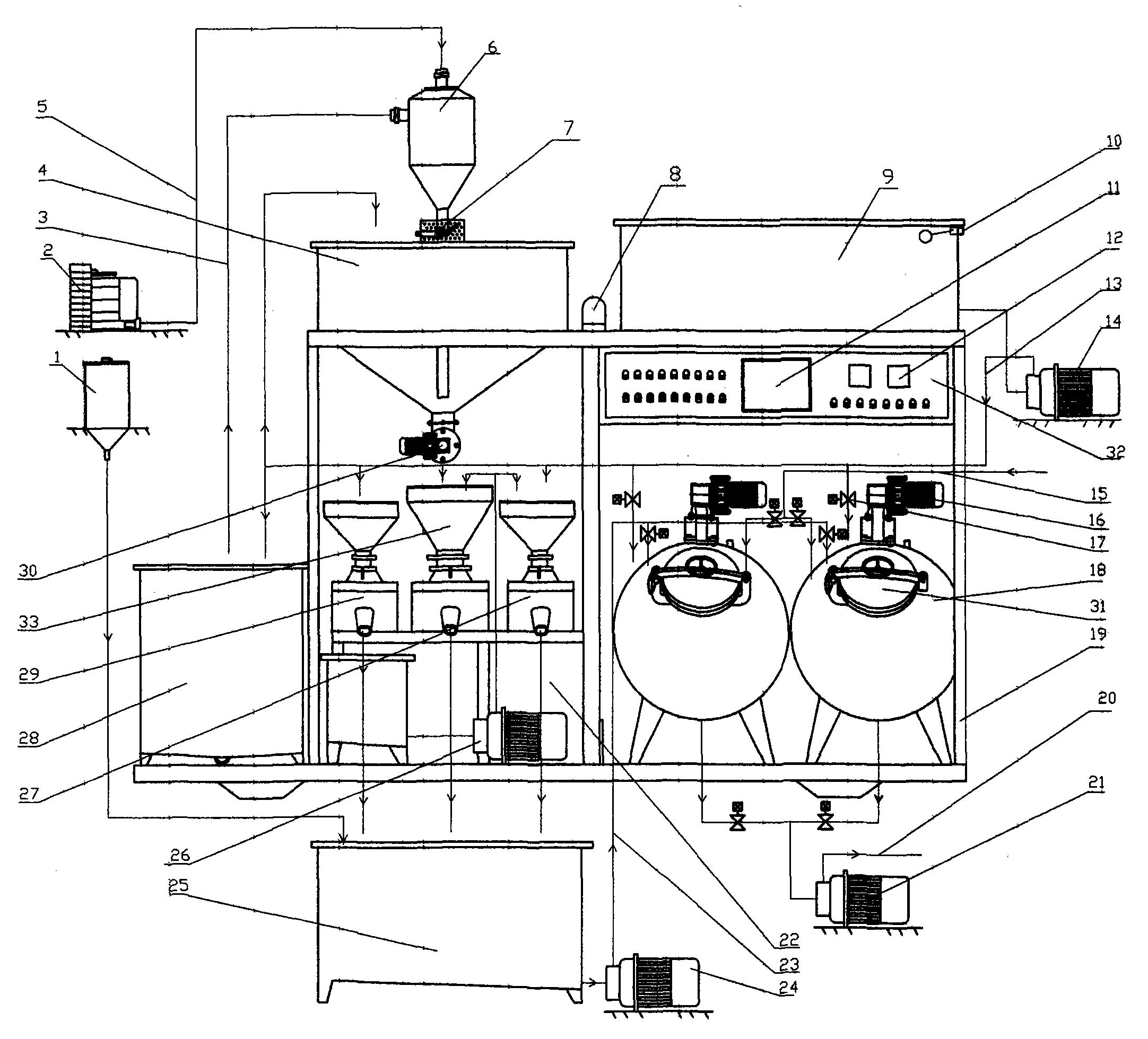本发明提供了一种环保节能全自动豆腐豆浆机,属食品加工设备,解决了现有设备由于各自分体独立设置带来的占用场地大,劳动强度大,生产效率低的问题,包括机架(19)、内部设置有可编程控制器的电气控制箱(32)、负压提豆机构、定量下料机构、磨浆分离机构和煮浆机构,在机架(19)的底架上设置所述的磨浆分离机构和所述的煮浆机构,在机架(19)的顶架上设置有定量下料机构、储水箱(9)、电气控制箱(32)和CIP循环水清洗装置。通过PLC控制磨浆分离机和增压泵以及相关电机和电磁阀等的启闭来实现磨浆和煮浆以及物料的转移,实现了整个泡豆、磨浆和煮浆全过程的自动化控制。