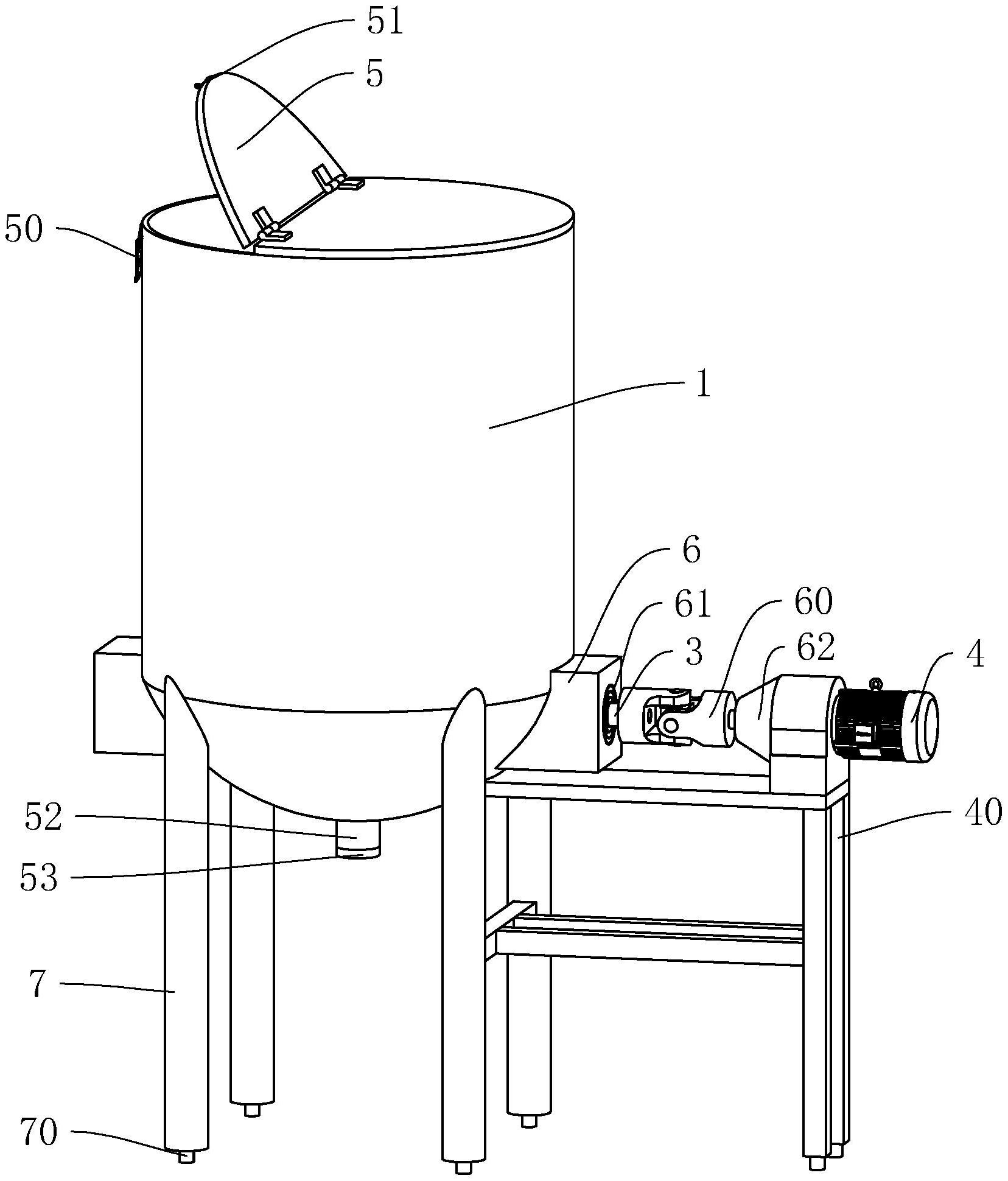本申请涉及一种水轮式往复搅拌蛋液设备,涉及食品加工设备领域,其包括罐体、驱动件以及搅拌件,所述搅拌件设置在罐体内部,所述搅拌件包括搅拌桨以及转动轴,所述搅拌桨安装在转动轴上,所述转动轴水平设置在罐体底部,所述驱动件设置在罐体外侧处,所述驱动件用于驱动转动轴进行转动。本申请具有实现批量生产混合蛋液的效果。