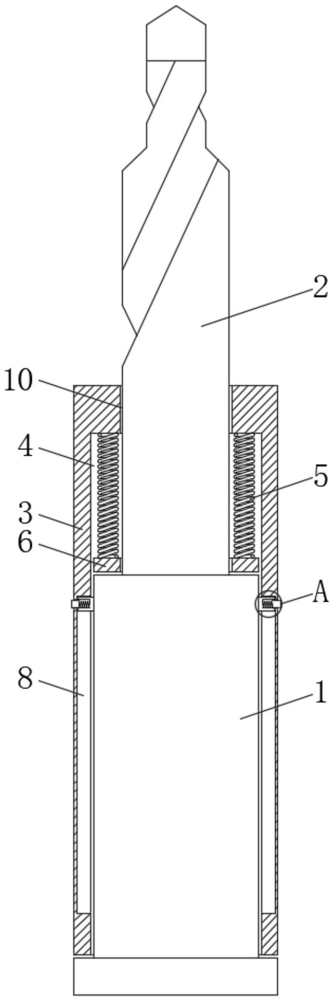 本实用新型涉及数控刀具技术领域,且公开了一种刀柄可调的PCD加工刀具,包括刀柄本体,所述刀柄本体的顶端固定安装有PCD刀具,所述PCD刀具的侧表面活动套接有护套,所述护套的底端开设有圆柱槽,所述刀柄本体的侧表面与圆柱槽的内部活动连接,所述圆柱槽内顶壁的左右两侧均固定连接有伸缩弹簧。该刀柄可调的PCD加工刀具,通过按动护套两侧的按钮,使两个按钮分别从两个插孔内相对移出至两个竖槽中,使两个伸缩弹簧弹力恢复,使推动护套向上移动,使刀柄本体两侧的安装块下滑至两个竖槽的内底壁处,使PCD刀具被保护在护套内,护套与台面撞击时两个伸缩弹簧可进行缓冲,从而防止刀具被撞断,进而便于PCD加工刀具的防护使用。
