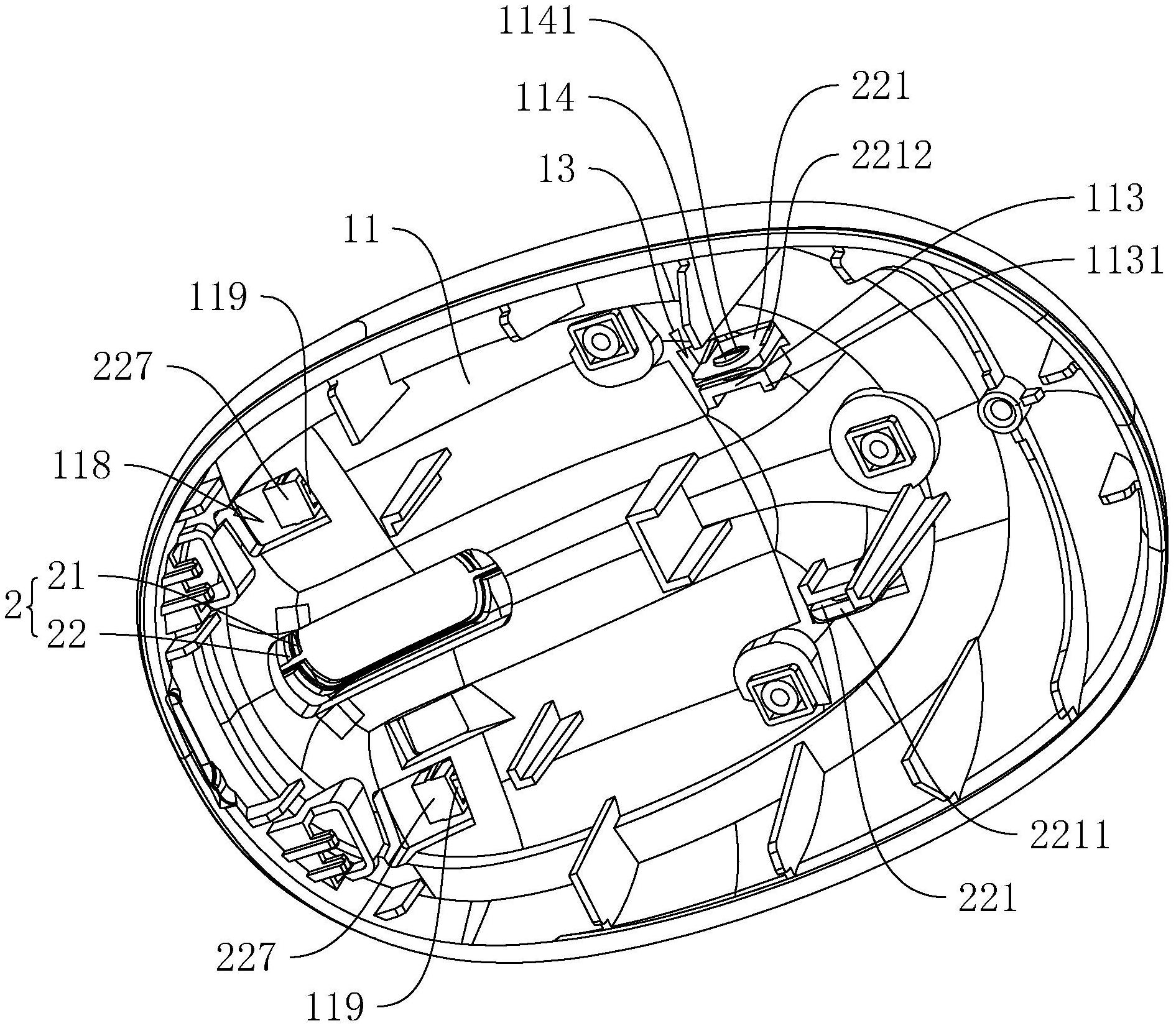 本申请涉及一种鼠标,包括壳体和按键盖,按键盖上固定设置有旋转块,壳体上开设有第一避位槽,旋转块穿过第一避位槽;壳体内固定设置有第一旋转轴,第一旋转轴穿过旋转块,旋转块与第一旋转轴转动连接;按键盖上固定设置有第一导向柱和第二导向柱;第一导向柱上固定设置有第一抵接块,壳体上开设有第一抵接槽和第二抵接槽,第一抵接块抵接于第一抵接槽的槽底;第二导向柱上固定设置有第二抵接块,第二抵接块位于第二抵接槽内,第二抵接块与第二抵接槽的槽底之间存在空隙;壳体上固定设置有第一弹性块,按键盖上固定设置有第二弹性块,第一弹性块抵接于第二弹性块。本申请减小了操作者在使用鼠标的过程中按压按键盖的力气。