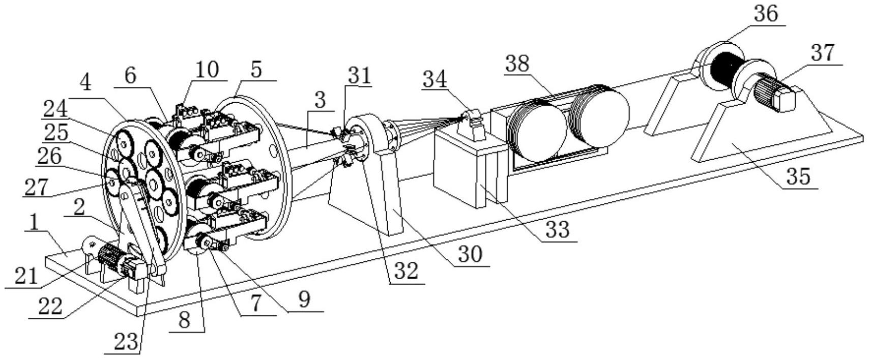 本实用新型公开一种电缆电线生产用笼绞机,包括底座,底座上固定安装有第一支座,第一支座上转动连接有主轴,主轴上固定安装有第一绞盘和第二绞盘,第一绞盘和第二绞盘之间转动连接有若干篮架;篮架上穿设有第一转轴,第一转轴上可拆卸连接有放线盘,篮架上固定安装有伺服电机,篮架远离第一绞盘的一端固定安装有张力传感器,篮架上转动连接有安装座,安装座上固定安装有气缸,气缸输出端固定连接有第一支架,第一支架远离气缸的一端转动连接有张力轮,张力轮位于张力传感器和第二绞盘之间,本申请通过以上设置实现了每股芯线张力的自动调节,保证每股芯线张力达到设定要求,本装置结构简单,适合大范围推广。