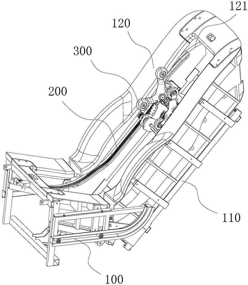 本实用新型属于按摩椅技术领域,具体涉及一种用于按摩椅的机芯行走机构,包括:座架,其一侧连接有可与座架相对转动调节的背架;齿条,其固定设置于座架和背架内,齿条上设置有凸起的第一啮合齿,齿条具有对称的两条,齿条具有弹性;行走组件,其两端分别连接于齿条并可沿齿条行走,行走组件具有第一转动轴和第二转动轴,第一转动轴和第二转动轴上连接有按摩机芯,第一转动轴两端分别设置有可沿齿条转动行走的的啮合轮。本实用新型采用具有弹性的L形齿条作为按摩机芯的行走导轨,齿条可以随着座架和背架的角度调节发生形变,行走组件可以沿着齿条将按摩机芯移动至座架部分达到全身按摩的效果,结构简单,实用性强。