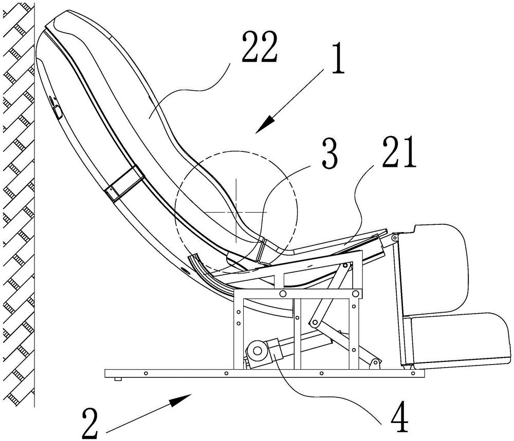 本实用新型公开了一种椅架结构,提供了一种结构简单,人体承载座在后仰过程中同步前滑,座椅占用空间小,方便在狭小空间使用的具有零靠墙摆放功能的按摩椅,解决了现有技术中存在的零重力按摩椅使用时占用空间大,使用场地具有一定的局限性,从而无法满足狭小空间状态使用要求等的技术问题,它包括底座及设于底座上的V形人体承载座,所述V形人体承载座通过互配的滑块和V形的滑槽滑动连接在底座上,滑块和滑槽互配滑动时,使V形人体承载座向前平移并保持同步向后翻转,或使V形人体承载座向后平移并保持同步向前翻转,且在底座上设有可带动V形人体承载座相对底座滑动的驱动装置。