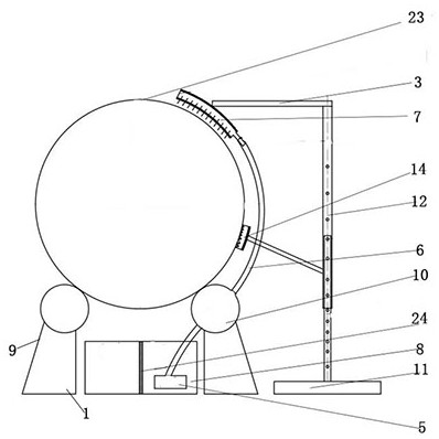 本实用新型公开了一种压力容器环缝焊接水冷工装,滚轮架一侧设置有支架,支架顶部固定有横臂,横臂靠近滚轮架的一端固定有喷水管,喷水管呈弧形结构,喷水管底侧开设有多个喷水孔,喷水管通过供水管连接水泵,水泵位于供水箱内,滚轮架用来放置压力容器,焊接时可以转动压力容器便于焊接,焊接过程暂停需要冷却焊缝时,开启水泵向喷水管供水,水从喷水孔喷出打在焊缝的位置,同时转动压力容器可以便于改变冷却位置,从而实现便于在压力容器环缝焊接时进行水冷的目的,冷却水通过压力容器筒体外壁流至最低点后落入供水箱内,可实现水循环。
