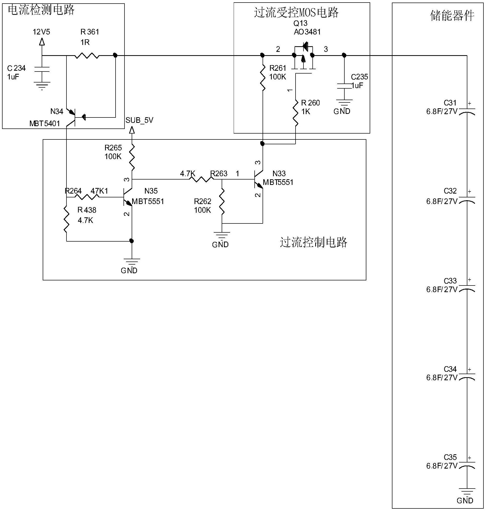 本实用新型提供了一种超级电容充电电路,其包括:电流检测电路、过流受控MOS电路、过流控制电路及储能器件,所述电流检测电路连接于直流充电电源与所述过流受控MOS电路之间,所述过流受控MOS电路与所述储能器件相连接,所述过流控制电路分别与所述电流检测电路和所述过流受控MOS电路相连接,所述储能器件有由多个超级电容串联组成。本实用新型的超级电容充电电路具有充电速度快且充电电流稳定的优点。
