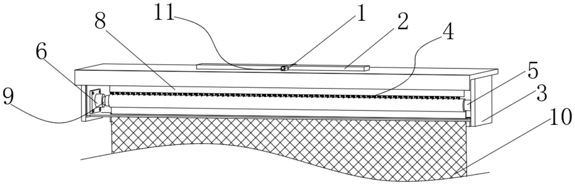 本实用新型公开了一种门窗用卷帘式纱网,涉及纱网技术领域,包括外框和盖板,所述外框的内侧两边均固定连接有电机支架,所述电机支架的表面固定连接有管状电机,所述管状电机的外周套接有卷管,所述卷管的表面传动连接有纱网,所述纱网的端部固定连接有垂板,所述外框的顶部开设有用于防止盖板的槽口,所述盖板的底部连接有清洁机构,可对所述纱网进行灰尘的清扫,所述外框的底部连接有收集机构,具备了通过设置管状电机带动纱网上下运动,使得清洁刷对纱网表面的灰尘进行清扫,节省了人力物力的使用,增添了实际生活中装置使用的实用性,并通过设置集尘盒通过磁条吸附在外框的底部,方便拆除安装集尘盒,能够及时的处理收集的灰尘。