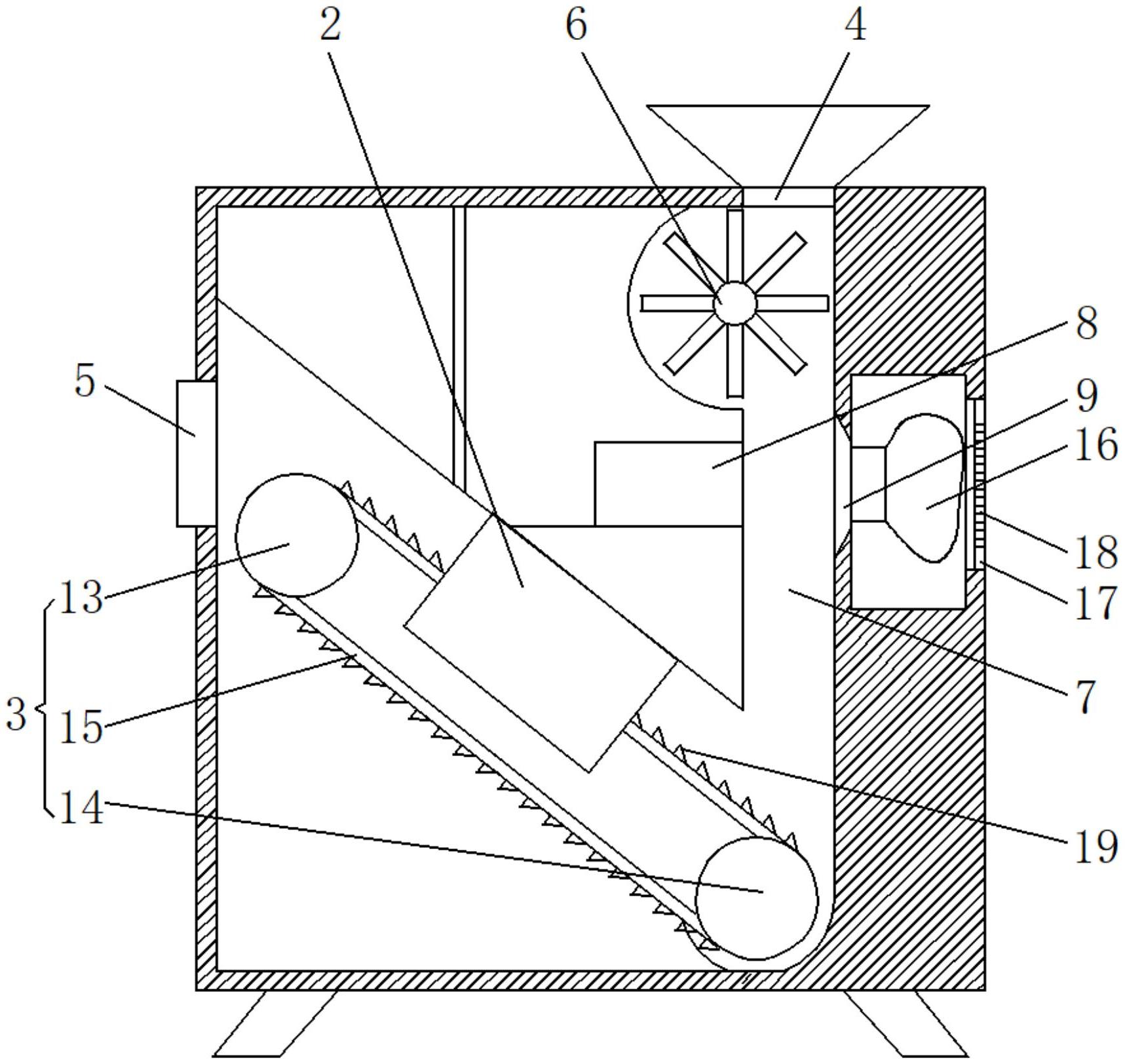 本实用新型公开了一种用于无纺布制造原料预热设备,包括箱体、预热机构和送料机构,箱体的顶部开设有进料口且左侧壁开设有出料口,进料口的内部设有进料转轮,进料口的下方设有进料流道,进料流道的左侧壁固定连接有风机,进料流道的右侧壁设有集尘筒,进料流道的底部设有预热机构,预热机构包括预热筒和加热管,加热管均匀固定在预热筒的内表面,送料机构包括电动机、主动辊、从动辊和送料钢带,主动辊和从动辊呈斜向分布在箱体内。本实用新型通过在箱体的内部设有预热机构,使原料颗粒进入螺杆上料筒后更加容易融化,通过在进料流道的内壁设有风机和集尘筒,方便去除原料内的粉尘,提高无纺布的生产质量。