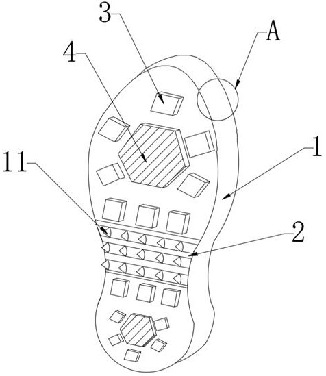 本实用新型涉及鞋类技术领域,公开了一种新型防滑鞋底,包括鞋底,所述鞋底前侧的上方设置有鞋掌,所述鞋底前侧的下方设置有鞋跟,所述鞋跟和鞋掌之间设置有鞋中部,所述鞋掌和鞋跟上均设置有防滑块,所述鞋掌和鞋跟上靠近防滑块的一周均设置有若干方形防滑凸起块。通过在鞋掌和鞋跟的下方设置防滑块,防滑块的四周设置若干的方形防滑凸起块,便于增大鞋底和地面的摩擦力,有利于提高鞋底的防滑性能,同时在鞋中部设置若干防滑齿,防滑齿之间由隔片隔开,通过防滑齿的支撑,进一步增强鞋底的抓地力,防滑齿和方形防滑凸起块、防滑块的配合使鞋底有较强的防滑性能,即使鞋底在湿滑或冰雪的路面上也具有良好的防滑效果。