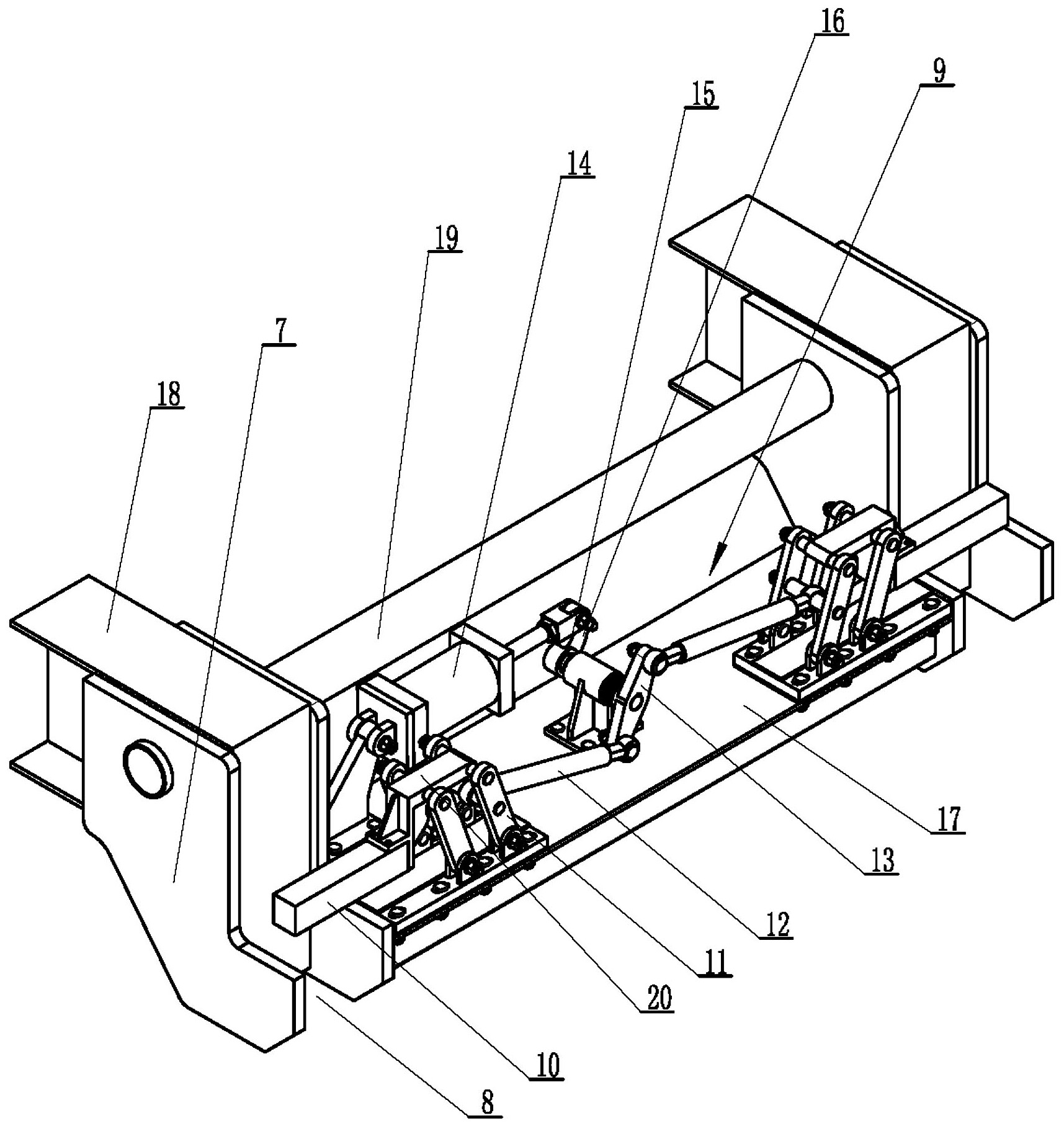 本实用新型涉及一种垂直提升机的四连杆限位装置。主要解决现有的垂直提升机中的载船平台升到最上端时处于悬停状态稳定性较差及可靠性差的问题。其特征在于:所述塔架(1)的上端两侧分别设有位于同一水平面的第一支撑架(3)及第二支撑架(4);所述第一支撑架(3)及第二支撑架(4)上均设有限位机构(9),所述限位机构(9)包括两个限位块(10)、四对连板(11)、两个连杆(12)、一个双向曲柄(13)及一个限位气缸(14)。本实用新型采用纯机械部件限定载船平台到达最上端的停止位置,并承载载船平台的全部重量,载船平台不晃动,稳定性好,不易出现故障,具有较好的可靠性。