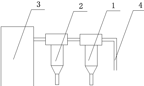 本发明涉及粉末生产设备用于颗粒物除杂,特别是一种二次旋风分离器。包括一级分离器、二级分离器和料斗,所述一级分离器和二级分离器分别与上料管连通,一级分离器的出料口通过连接管与二级分离器连通,二级分离器的出料口与出料管连通。本发明改变了现有设备的管路连接结构,将小部分物料通入二级分离器直接除杂,大部分物料经过一级分离器除杂后再导入二级分离器进行除杂,可有效发挥二次旋风分离器的性能,提升生产效率。