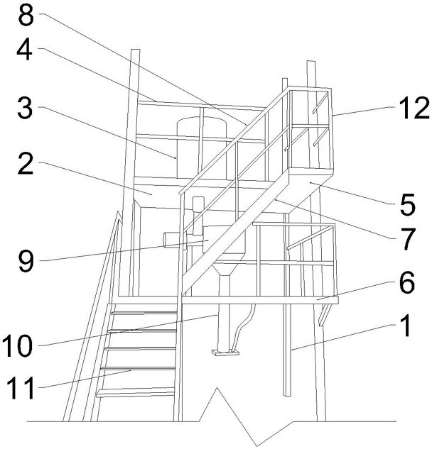 本实用新型提供粉末涂料混合加工台架,它包括有固定在车间内转角处的内立柱,内立柱上部设有上层平台,上层平台上设有一次混料机构,一次混料机构通过一次提升机构与原料输送机构连接,上层平台边缘处设有上层防护栏,其中一侧的上层防护栏端部开有进出口,进出口外侧的上层平台延伸形成转角台,上层平台下方设有中层平台,中层平台外侧延伸至转角台下方,转角台与中层平台之间设有转角梯。本方案大大提高产品的质量和加工速度。