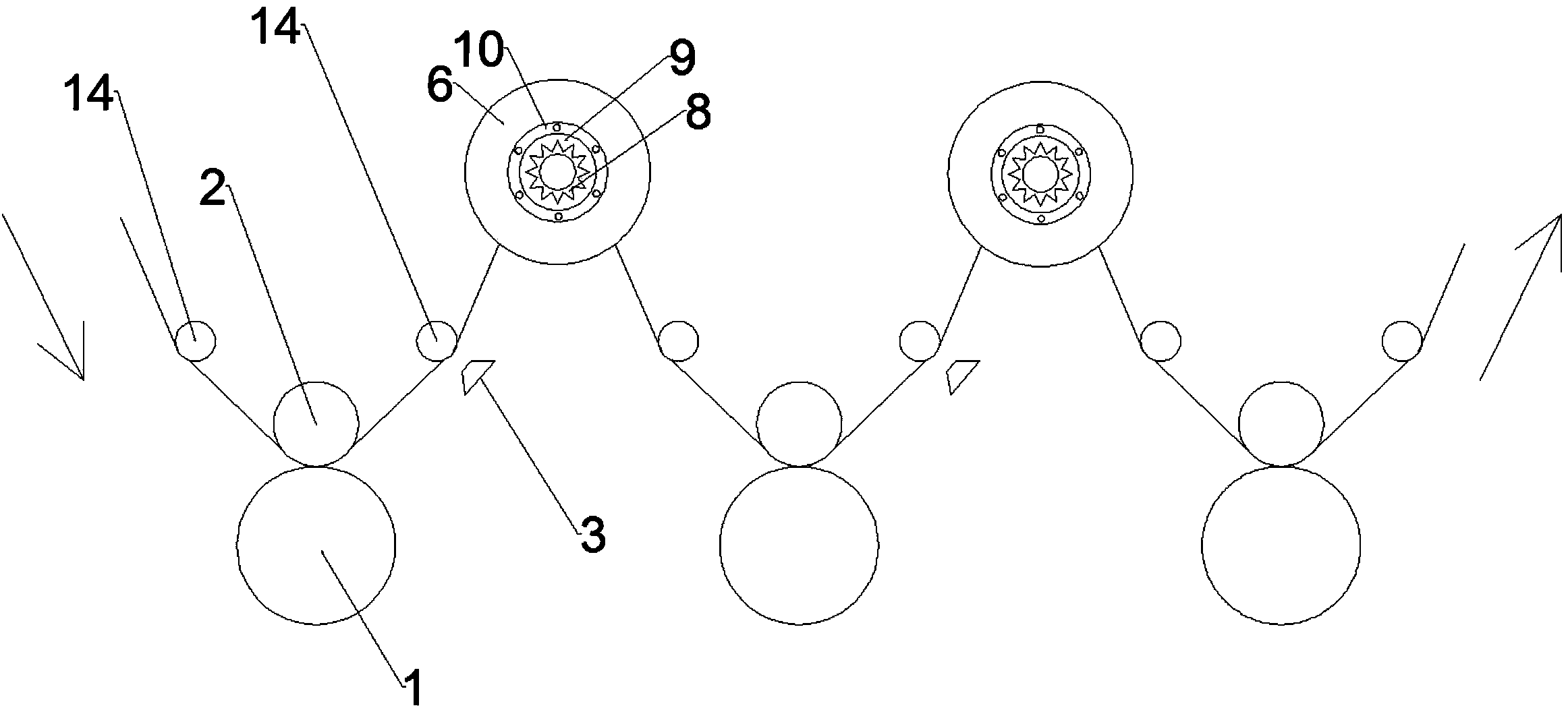 本实用新型公开了一种装饰纸的印刷套色系统,包括:印刷辊,设置于印刷辊上的印刷胶辊,设置于印刷辊一侧并识别色标的识别件,接收经过识别后的纸张的修正辊装置,连接于识别件并控制修正辊装置旋转的控制器;修正辊装置组成有:修正辊组件,设置于修正辊组件内的微调辊组件,设置于修正辊组件、微调辊组件两侧的固定盘组件。本实用新型通过识别件识别色标,计算色标与预定检测位置之间的距离,控制修正辊装置修正纸张位置,修正辊装置设置有微调辊组件,能够在修正辊的基础上再进行微调,提高套色精确度,使得纸张偏离间隙小,提高产品质量。