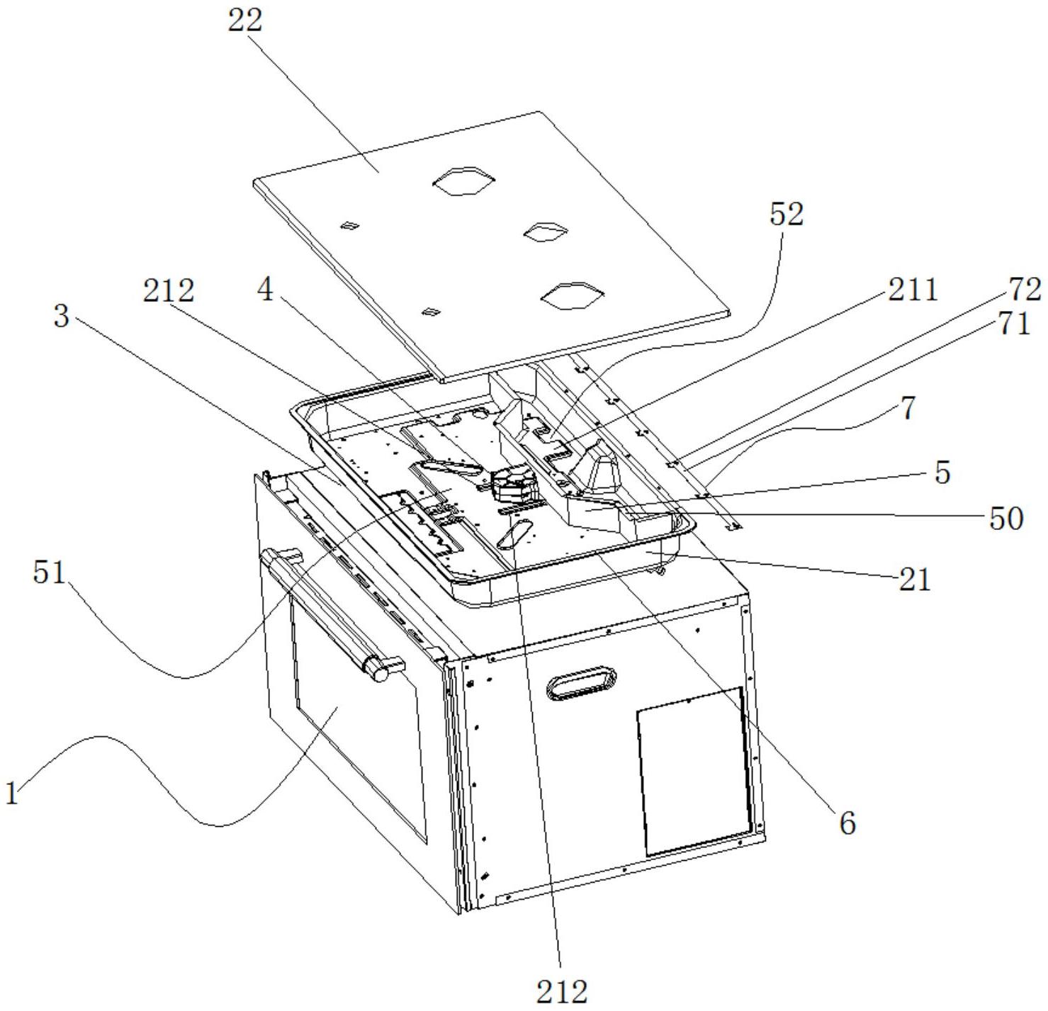 一种集成灶,包括蒸烤单元和设置在所述蒸烤单元上方的灶具,所述蒸烤单元和所述灶具之间具有安装间隙,所述灶具包括灶具壳体,所述灶具壳体包括底盘和盖设在所述底盘上的面板,所述底盘与所述面板之间还形成有散热缝隙,所述底盘开设有散热孔,所述散热孔处设置有散热风机,所述散热风机将所述安装间隙中的热气吸入所述灶具壳体内并经所述散热缝隙排出所述灶具壳体。按照本实用新型提供的技术方案与现有技术相比具有如下优点:充分利用现有结构、设计巧妙结构简单、部件数量少、便于生产装配、成本低、散热效率高、噪声低。