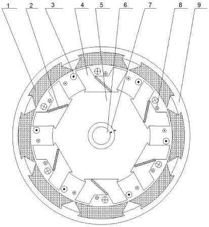 一种电动汽车低谐波含量的轮毂电机,属于汽车电器技术领域。包括定子和转子,其特征在于:转子包括轮毂(9)以及其内表面的导磁块(1);定子位于轮毂(9)的内部,定子包括定子固定块(5)和其外圈的若干定子铁心(4),每个定子铁心(4)包括两个定子极,在定子铁心(4)的定子极上缠绕有辅助绕组(3)和电枢绕组(8);在定子铁心(4)中倾斜设置有永磁体(2);电枢绕组(8)设置有多相,多相电枢绕组(8)依次缠绕在不同定子铁心(4)的定子极上。在本电动汽车低谐波含量的轮毂电机中,通过在定子铁心内设置辅助绕组,解决了现有技术永磁无刷轮毂电机励磁不可调的缺陷,提高了经济型。