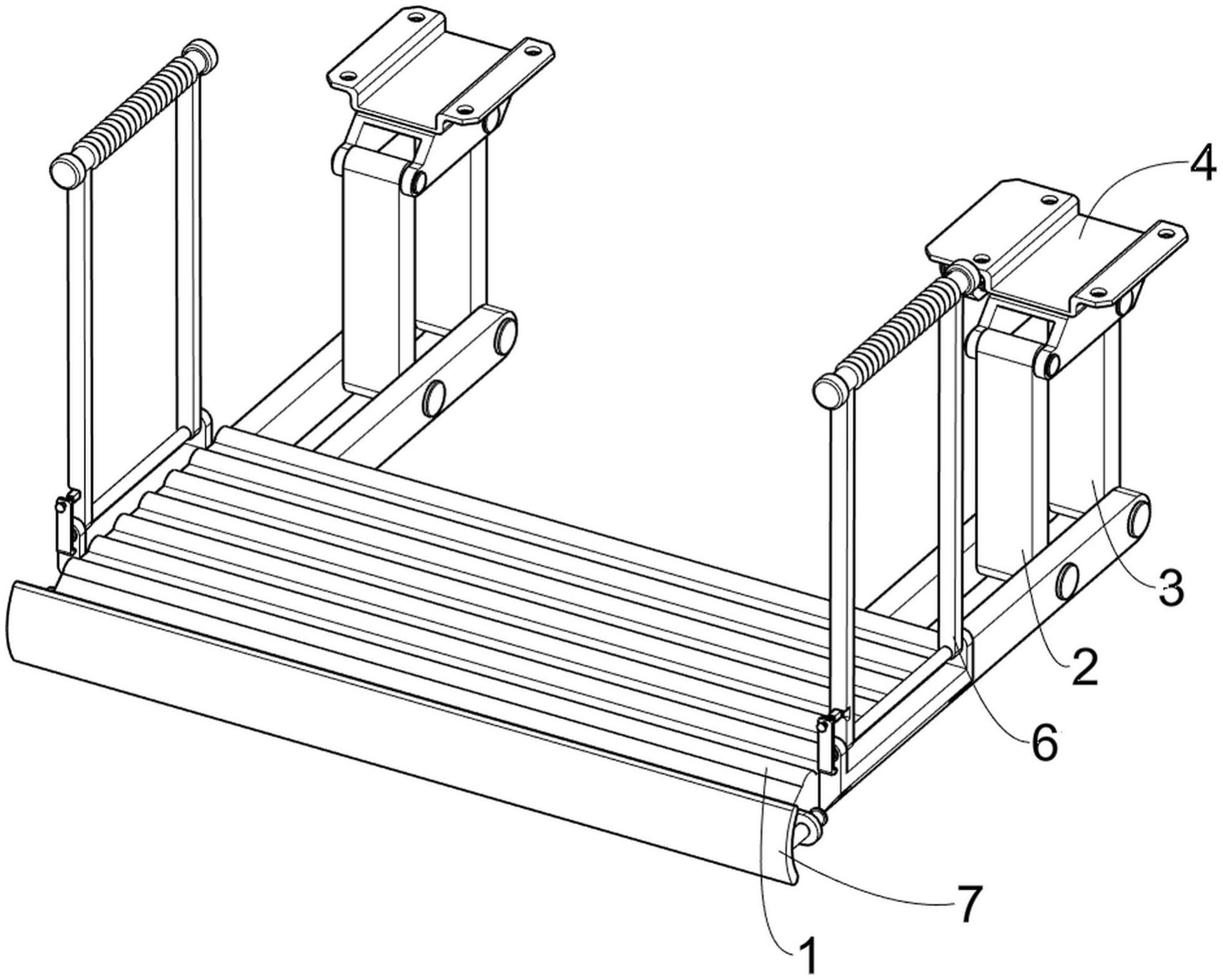 本实用新型涉及房车领域,尤其涉及一种可伸缩式房车踏板梯。本实用新型的目的是提供一种能够辅助腿脚不便的房车用户进行上下房车操作,提高腿脚不便的用户上下房车时的安全性的可伸缩式房车踏板梯。一种可伸缩式房车踏板梯,包括有踏板和第一转动杆等,踏板后部左右两侧均转动式连接有第一转动杆。本实用新型通过转动扶杆转动竖直,并由定位块和复位弹簧进行配合,对转动扶杆进行固定的操作,能够达到辅助腿脚不便的房车用户进行上下房车操作,提高腿脚不便上下房车人员踩踏踏板时的安全性的效果。