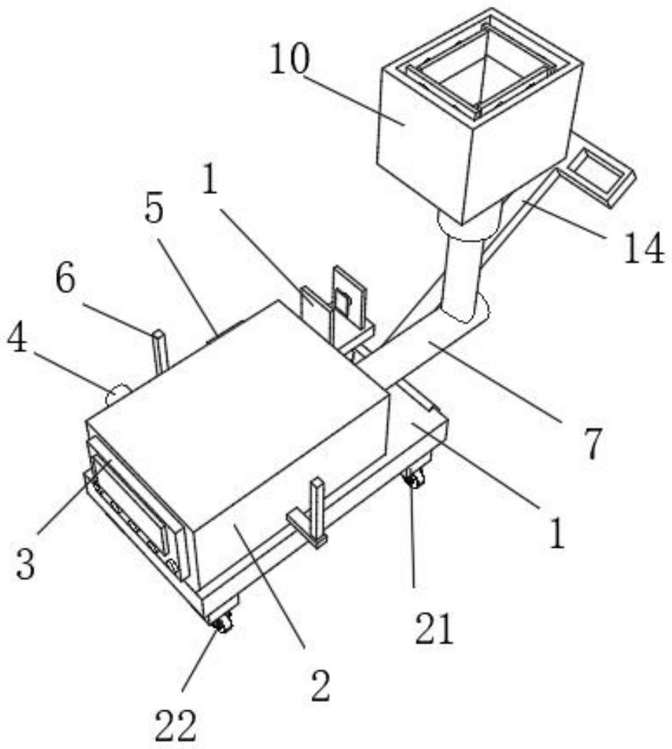 本实用新型涉及中央空调检测技术领域,公开了一种中央空调能效在线检测装置,包括底座,所述底座的顶部右侧固定连接有测试箱,所述测试箱的右侧固定连接有控制器,所述测试箱的前侧右端固定连接有计时器,所述测试箱的前侧左端固定连接有显示屏,所述测试箱的左侧中端设置有输送管,所述输送管的顶部外壁固定连接有防护接口,所述防护接口的前侧设置有风量测量计,所述防护接口的顶部固定连接有连接箱,所述连接箱的内部顶侧四周均固定连接有两个伸缩柱,所述伸缩柱的外壁设置有弹簧。本实用新型中,通过电动推杆推动夹持设备升降,对输送管进行紧固夹持,代替工作人员手持输送管,达到减轻工作强度的效果。