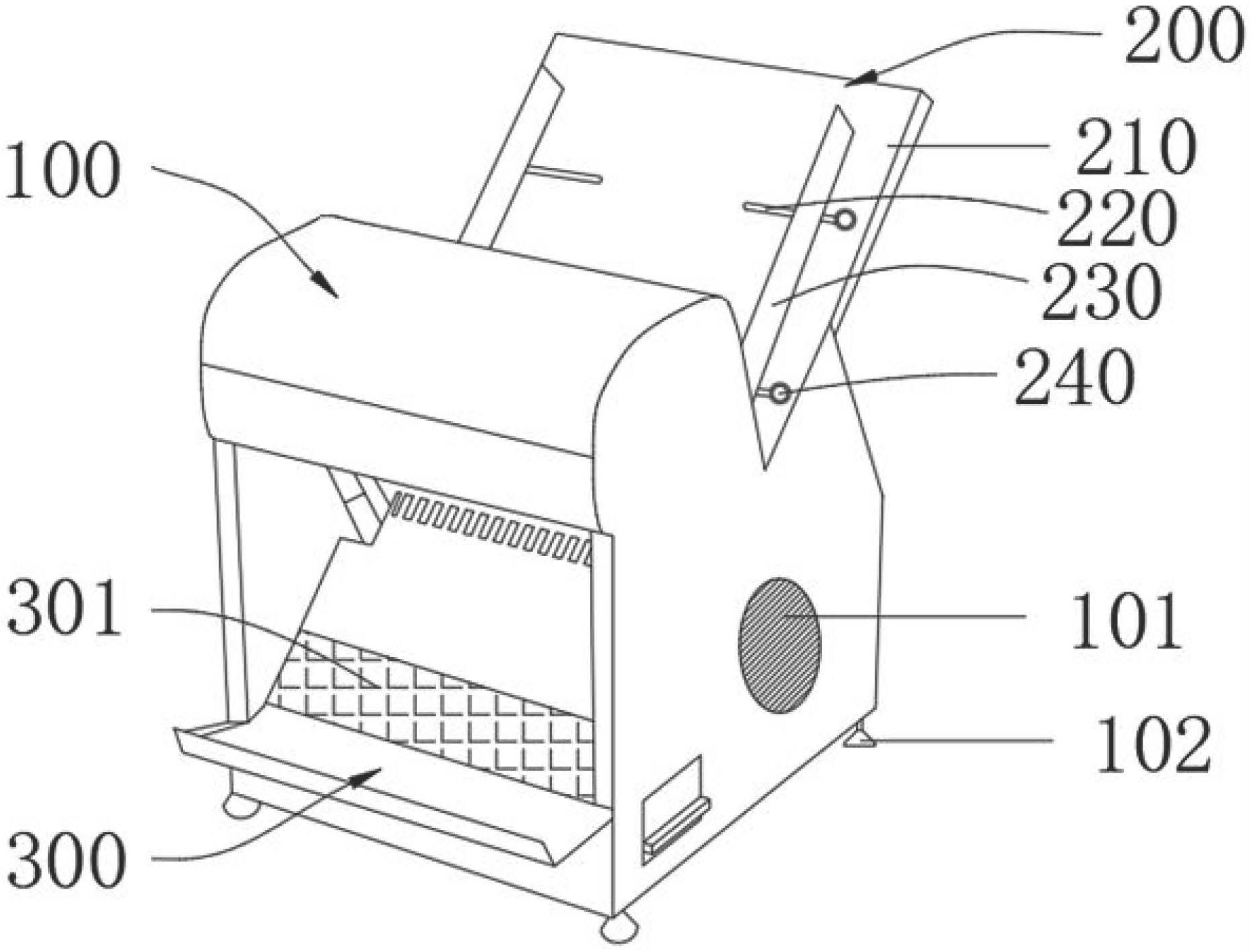 本实用新型公开了一种面包切片机,包括:壳体,所述壳体为空心长方体结构,且壳体的顶部右侧和左侧下部均设置有开口,所述壳体侧壁设置有透气孔;上料组件,所述上料组件安装在壳体内腔顶部右侧,且上料组件呈倾斜状布置;下料板,所述下料板固定安装在壳体内腔底部,所述下料板与上料组件下端对应,所述下料板下部设置头格栅状通槽;切割组件;回收组件;本实用新型通过回收组件包括安装在壳体内腔底部且与通槽连通的回收槽和与回收槽连通的风机,所述风机的排风端与透气孔对应,所述回收槽与风机进风口处呈滤网状,使用时,通过风机提供吸力将面包屑从通槽处吸入回收槽中并被回收槽截留下来,起到自动收集的作用。