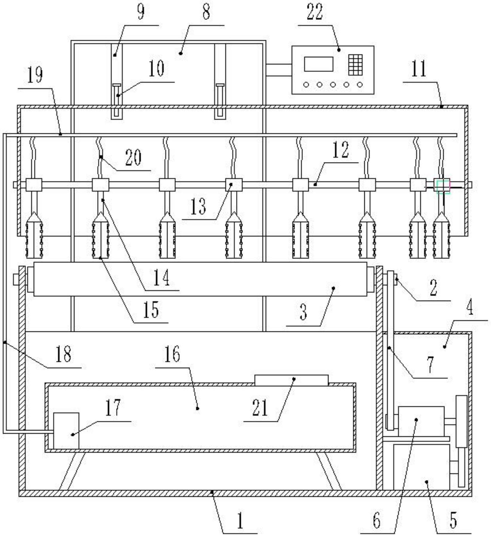 本实用新型公开了一种摆放月饼胚码盘机,包括箱体,箱体的上端设有与其旋转连接的转轴,转轴上缠绕设有传送带,箱体的侧端固定有机箱,机箱的底部固定安装有电机,电机的上端设有与其机械连接的减速机,减速机通过皮带与转轴传动连接,箱体的侧端上固定有罩体,罩体顶面底部垂直固定有两个相互平行的定位杆,定位杆上固定有调节机构,调节机构的下端设有壳体,壳体之间水平固定有固定架,固定架上套有与其滑动连接的套筒,通过框体可将月饼胚分离到设定好的合适距离,并且通过PLC控制器便于调整传动带速度,通过调整框体间距达到调整月饼胚间距的效果,通过套筒调整框体位置及数量,通过软管将料箱中的面粉喷至月饼胚侧端有效的防止粘连。