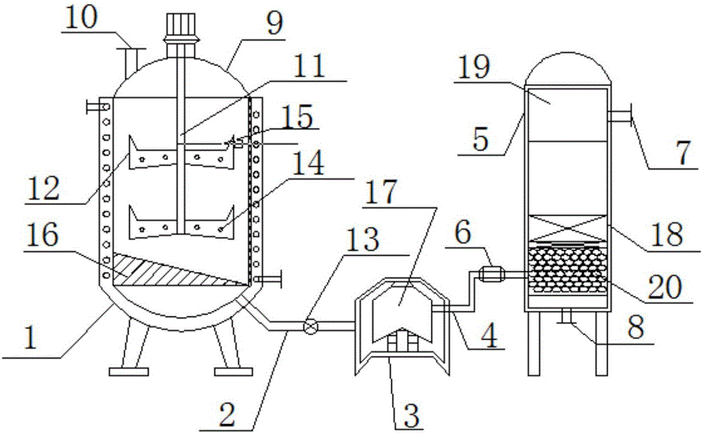 本实用新型涉及化工反应设备技术领域,尤其是一种用于合成三氟乙醇的装置;包括反应釜,反应釜的底部通过连接管与离心装置连接,离心装置通过管道与精馏塔连接,管道上有电动泵,所述精馏塔的顶部有产品出口,精馏塔的底部有剩余物料出口;本实用新型中釜体内部底部有一块倾斜板,倾斜板的低端朝向出料口设置,采用此结构,仅需要很少的动力就可以使得釜体内的物料完全排出,能耗低;本实用新型的结构简单,反应转化率高,产物易分离。