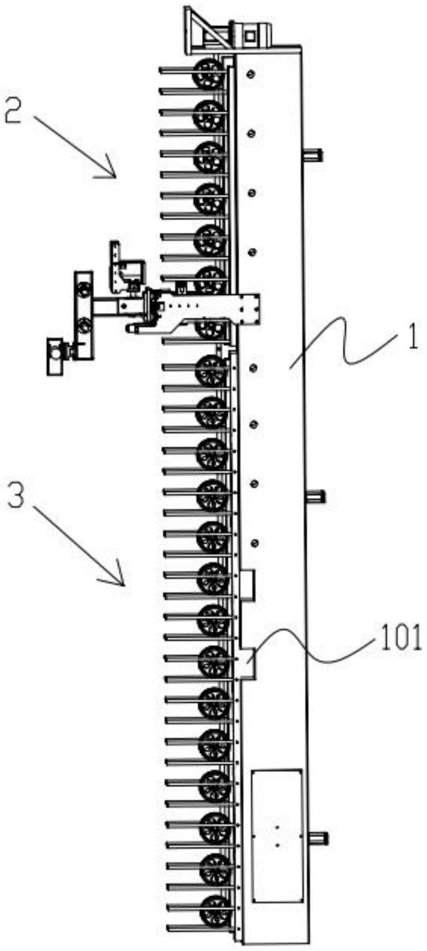本实用新型涉及包覆机输送技术领域,具体公开了一种包覆机输送架,通过将输送装置分为移动输送段和固定输送段,在面对各种异形材料需要输送覆膜时无需根据材料的型号进行反复调节,节省时间和人力成本,只需将移动输送段与固定输送段连接的万向连接套拆解,即可更换相应的移动输送段,并且在机架上对应移动输送段设有U形槽,在更换移动输送段时可用叉车通过U形槽对其进行叉送,大大提高了更换效率,节省了更换、调试成本;并且更换下的移动输送段可叠放于墙边,大大节省车间空间。