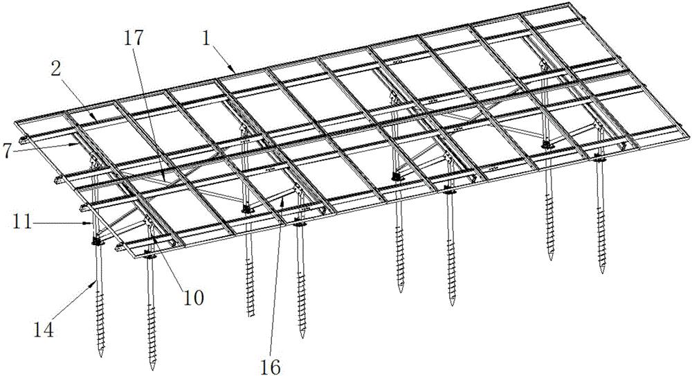 本实用新型涉及一种双立柱地面光伏支架通过将立柱和螺旋桩分开,并在立柱和螺旋桩之间增设了底脚,底脚上设有锯齿面,并通过在底脚和立柱之间设置带齿垫块,底脚的锯齿面与带齿垫块的锯齿面相互咬合,从而使得底脚与前立柱、后立柱固定牢靠;导轨由多段拼接而成,相邻两段导轨之间通过导轨连接杆固定起来,再通过导轨紧固装置紧固,从而提高了导轨之间的连接强度;另外前立柱、后立柱之间还设置有斜撑,相邻两个后立柱之间还设置有多根拉杆,斜撑和拉杆可以提高光伏支架的整体强度,进而延长光伏支架的使用寿命。