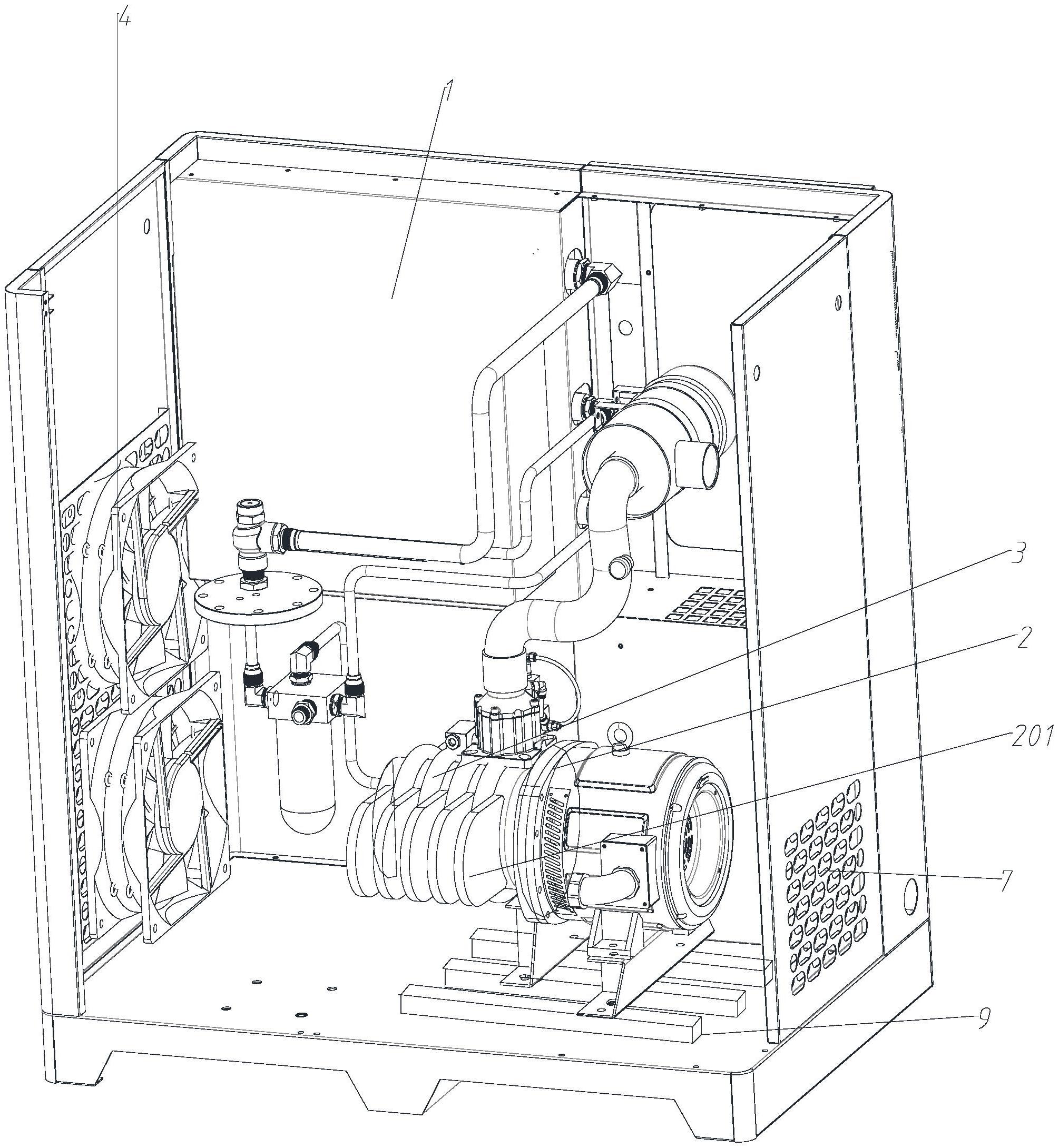 本实用新型涉及空压机散热的技术领域,提出了一种节能的永磁变频空压机散热机构,包括,机壳,金属翅片,所述金属翅片卡设在空压机头上,冷却管,所述冷却管设置在空压机头上,且位于所述多个金属翅片之间,负压装置,所述负压装置设置在所述机壳上,所述负压装置用于利用产生的负压带动所述机壳内空气流动。通过上述技术方案,解决了现有技术中的空压机在持续工作或者环境温度高的情况下散热效果差的问题。