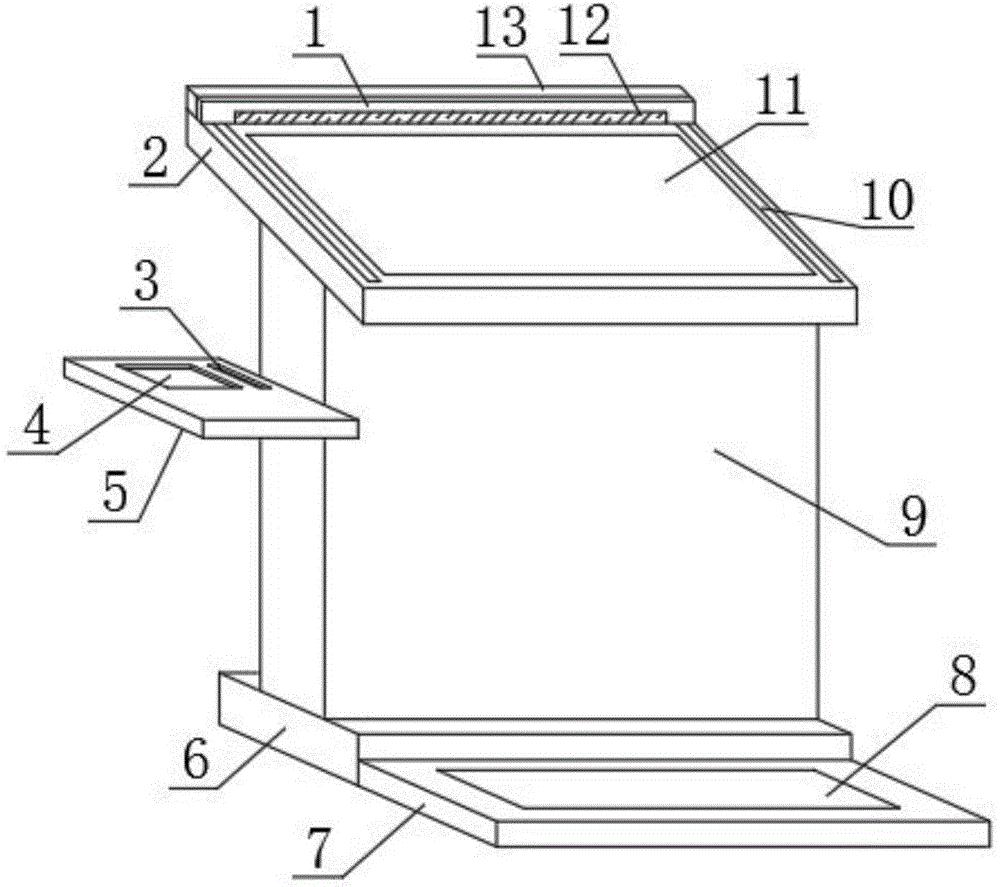 本实用新型公开了一种具有测量儿童体征的签到装置,包括电子签到机本体,还包括测量机构和清洁机构,所述电子签到机本体包括电子面板、电子面板底部的签到机底箱和签到机底箱底部的签到机底座,所述电子面板的表面设置有触摸屏,所述测量机构安装在签到机底箱的侧表面,所述测量机构包括签到机底箱侧表面的血压仪放置槽和血压仪放置槽一侧的体温计放置槽,所述签到机底座的侧表面设置有体重秤座,使儿童可以进行血压与体温等体征的测量,非常方便;而且在签到机的触摸屏表面粘附的灰尘,只需要滑动清洁滑架进行清洁,由于清洁滑架底部的清洁棉板可以完全覆盖接触触摸屏,清洁比较全面,且操作简单,劳动量较小。