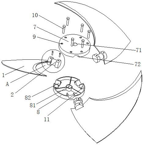 本实用新型公开了一种蒸发式冷气机可调节角度的扇叶,包括风叶,所述风叶有三个,且三个风叶的连接处设有前盖和后盖,前盖的下表面设有三个均匀分布的上弧形槽,与上弧形槽对应前盖的上表面设有三组均匀分布的第三螺孔,且每组第三螺孔有两个,第三螺孔与锁紧螺丝的侧面上端螺纹连接,后盖的上表面设有三个均匀分布的下弧形槽,与下弧形槽对应后盖的下表面设有三组均匀分布的第四螺孔,且每组第四螺孔有两个,锁紧螺丝的侧面下端与第四螺孔螺纹连接。该蒸发式冷气机可调节角度的扇叶,结构简单,方便拆卸和组装,能够根据风量大小调节风叶的角度,能够做到一模多用,一叶多用,节约成本,操作简单,使用方便。