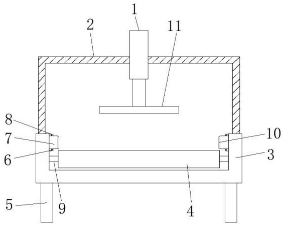 本实用新型涉及木门技术领域,公开了一种免漆木门冷压成形加工装置,包括传输平台,所述传输平台的内部转动设置有输送辊,所述输送辊的外部设置有输送带,所述传输平台的两侧内壁均固定连接有固定板,所述固定板位于输送带的上方,所述固定板的内部的上下两侧内壁均设置有转轴,两个所述转轴之间转动设置有辊筒,所述传输平台的顶端固定连接有固定架,所述固定架上固定穿设有液压缸。本实用新型技术方案通过固定板能够对辊筒进行安装,并且在转轴的作用下,能够实现辊筒的转动,当木门在输送带上传送偏移时,木门会与辊筒进行碰撞或者产生摩擦,辊筒能够保证木门传送时的流畅性,不影响木门的正常输送,方便实用。