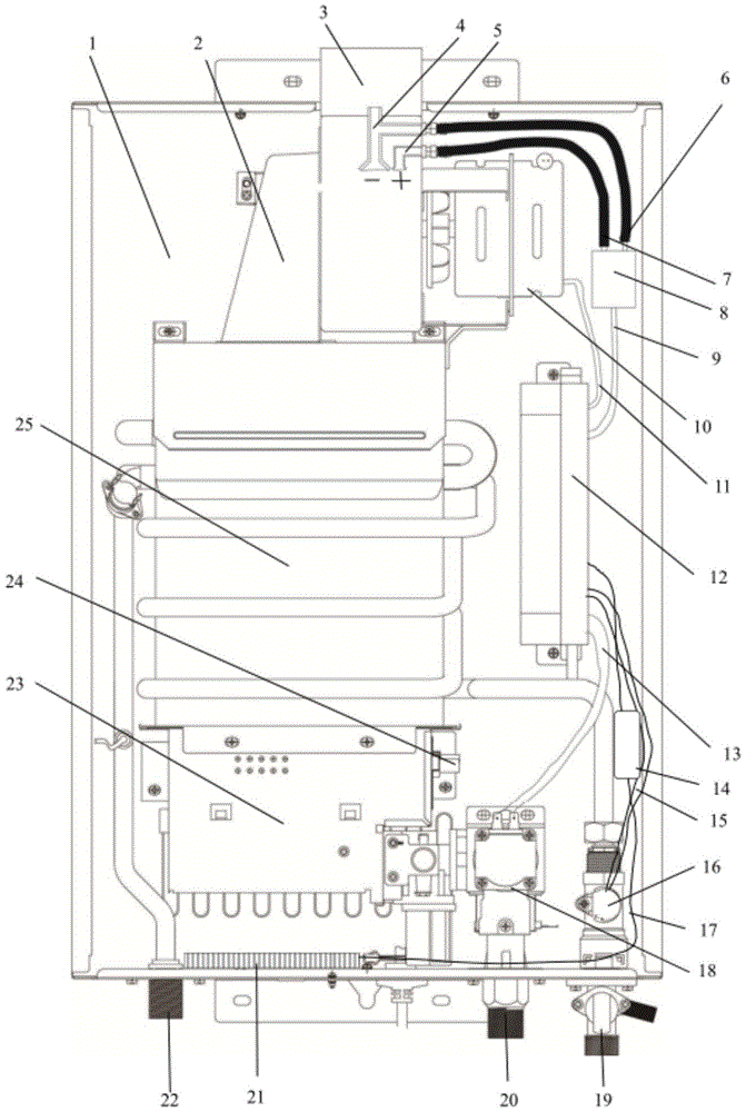 本实用新型公开了一种带漏水报警系统的燃气热水器,包括壳体、热交换器、燃烧器、排烟装置、漏水报警装置和控制器;漏水报警装置包括漏水保护报警器、漏水保护传感器,漏水保护传感器安装于壳体的底部,并通过第五连接线与漏水保护报警器相连接,漏水保护报警器还与控制器相连接。本实用新型的有益效果是,在燃气热水器中安装漏水报警装置,当壳体底部的漏水保护传感器检测到漏水水滴时,会以电信号传递给漏水保护报警器,漏水保护报警器发出警报,漏水保护报警器还以电信号的方式传递给控制器,控制器停止燃气热水器的工作状态;另外,还可通过手机APP通知用户及时检修,保障使用安全,给客户带来更好的体验。