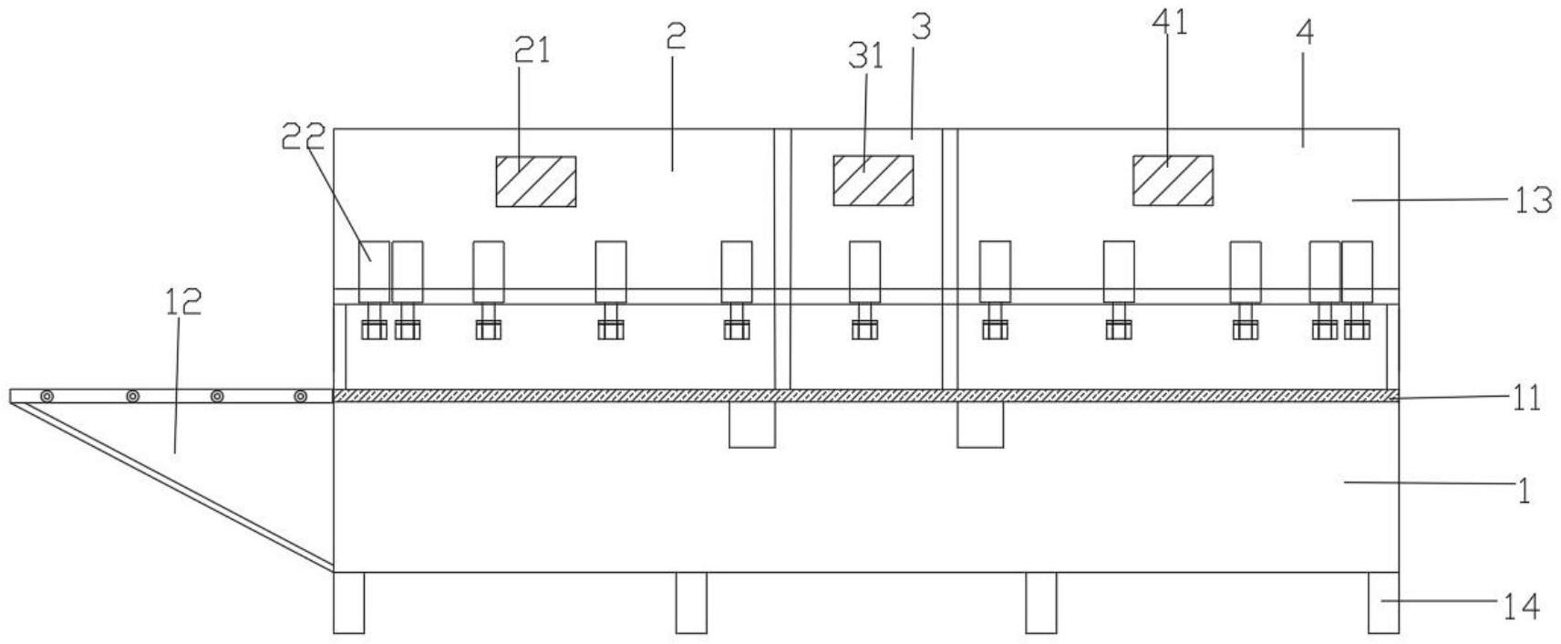 本实用新型公开了一种门板材加工用液压组合冲床,包括承载机构、第一冲床、第二冲床和第三冲床,第一冲床、第二冲床和第三冲床并列设于承载机构,且第二冲床位于中间位置;承载机构包括底座、工作台和支撑架,工作台与底座顶端焊接,支撑架与底座焊接;冲床机构包括下模座、复位弹簧和冲压组件,下模座焊接于工作台上,复位弹簧一端与下模座连接,复位弹簧另一端与冲压组件连接,冲压组件包括冲子、上模座、活塞和液压缸,液压缸与支撑架固定连接,活塞一端与液压缸连接,活塞另一端与上模座一端固定连接,上模座另一端焊接有复位弹簧,解决了现有技术中门板材加工用液压冲床每个工位不能单独工作的问题。