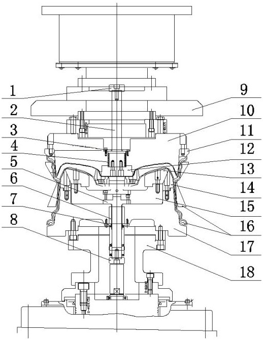 本实用新型涉及轮缘成型设备技术领域,提供了上下双向旋轮缘成型装置,包括装置本体和设在装置本体上的固定组件和移动组件;固定组件包括下模座和固定在下模座上的旋压下模,旋压下模可拆卸连接有下模压块;移动组件包括上模座、驱动部件和设在上模座上的旋压上模,驱动部件驱动上模座带动旋压上模朝向旋压下模靠近或远离,旋压上模外侧靠近旋压下模的一端可拆卸连接有垫环,垫环设有装夹定位平面;通过设置固定组件和移动组件,对上轮缘平面进行定位车削轮毂,可以直接成型上轮缘平面,减少一道工序,节约了人力资源,提高了加工效率,降低了生产成本,轮毂的动平衡和跳动都有改善和提高,使得成型的轮缘平面尺寸比较稳定,提高了产品合格率。