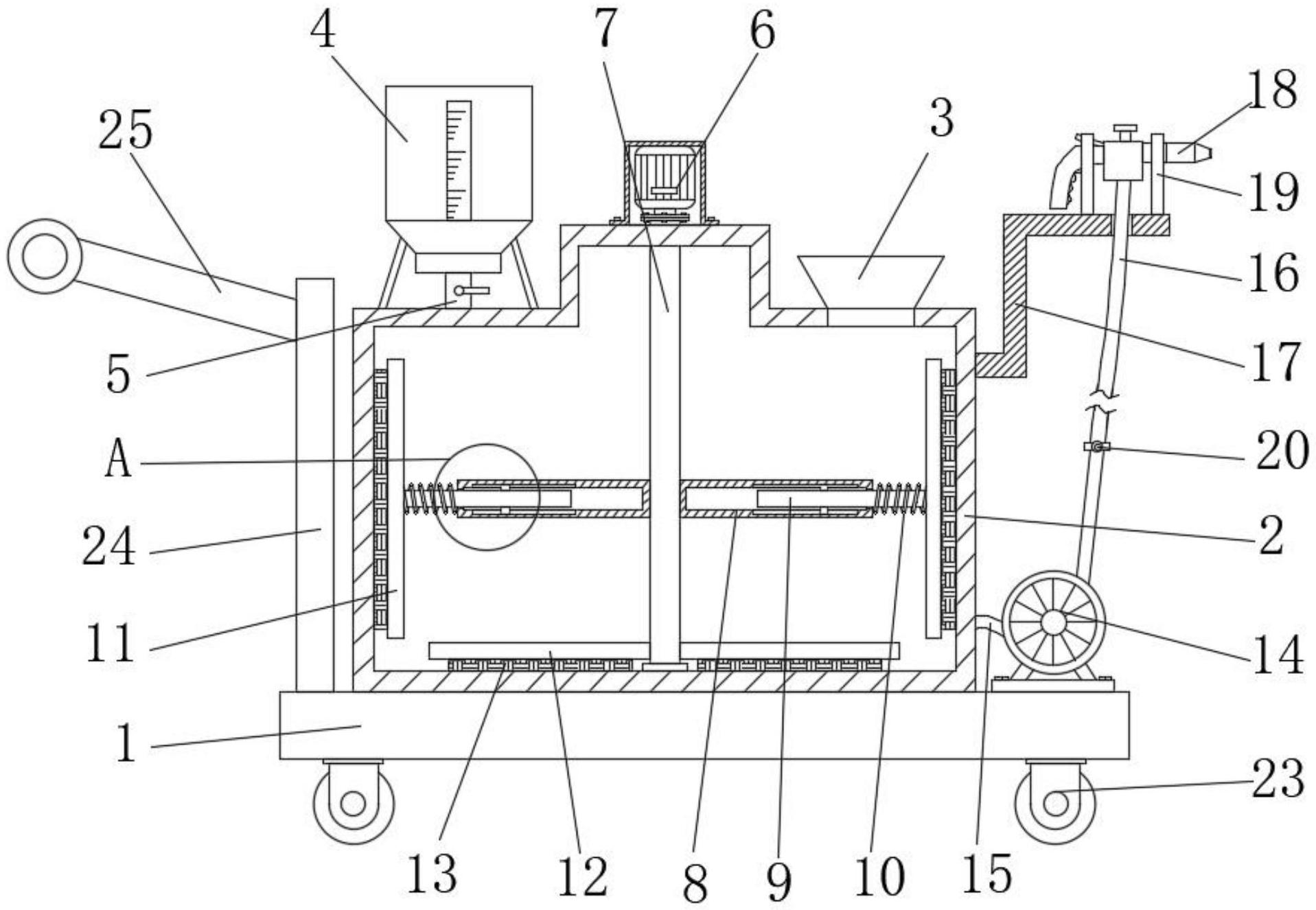 本实用新型涉及室内净化技术领域,且公开了一种室内除霉喷雾装置,包括底板,还包括箱体,其位于底板的顶部的中间位置,所述箱体顶部的右侧固定安装有入料斗,所述箱体顶部的左侧设置有水箱,所述水箱的底部连通有出水管,所述出水管的另一端与箱体相连通;本实用新型通过底板、箱体、入料斗、水箱、电机、旋转杆、固定管、直杆、第一刮板、第二刮板、毛刷、水泵、连接管和喷雾头的设置,使其具备了可以对喷雾装置的内壁进行大面积清理,且方便对墙体边角进行除霉的优点,解决了目前的除霉喷雾装置不方便对其内壁进行清理,长期使用后药物会附着在内壁,且不方便对墙体的边角进行喷雾除霉的问题。