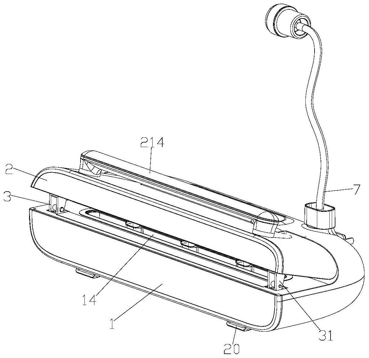 本发明公开了一种真空封口机,包括机体、上盖、控制装置、真空泵体、加热封口装置、锁紧装置和缓冲装置,机体上设有下真空仓,上盖对应下真空腔的位置处设有上真空仓,下真空仓连通真空泵体,真空泵体和加热封口装置均与控制装置电性连接,上盖的一端与机体可转动连接,另一端可盖合于下真空仓;上盖的底部开设第一凹槽,上真空仓可活动地安装于第一凹槽,缓冲装置设置于上真空仓和上盖之间;锁紧装置包括相互配合的锁块组件和传动组件,锁块组件设置于上盖的底面,机体的上端面开设有插孔,传动组件设置于机体内且位于插孔的一侧,传动组件与控制装置电性连接。本真空封口机锁紧效果好、操作方便、安全性高、抽真空顺畅、适用性强。
