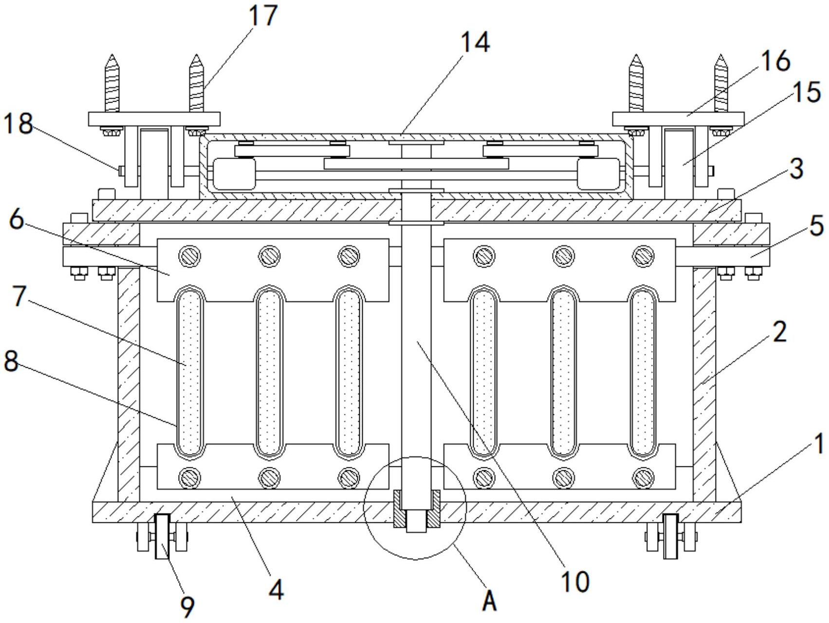 本实用新型公开了一种高强度封闭式母线槽,涉及母线槽技术领域,包括底板,所述底板的上表面固定连接有侧板,所述侧板的顶部通过螺栓固定安装有盖板,所述底板的上表面固定连接有下安装条,所述侧板的顶部通过螺栓固定安装有上安装条,所述下安装条的上表面与上安装条的下表面均固定安装有绝缘压块,本实用新型中,旋转锁头,锁头带动转轴转动,转轴通过摆动件带动摆动杆摆动,摆动杆推动滑块向两侧移动,滑块推动卡杆向外侧移动,卡杆插入连接块、安装座的通孔内,完成对全钢母线槽的固定安装,无需在安装时使用大量的螺栓进行固定,大大提高看工作效率。