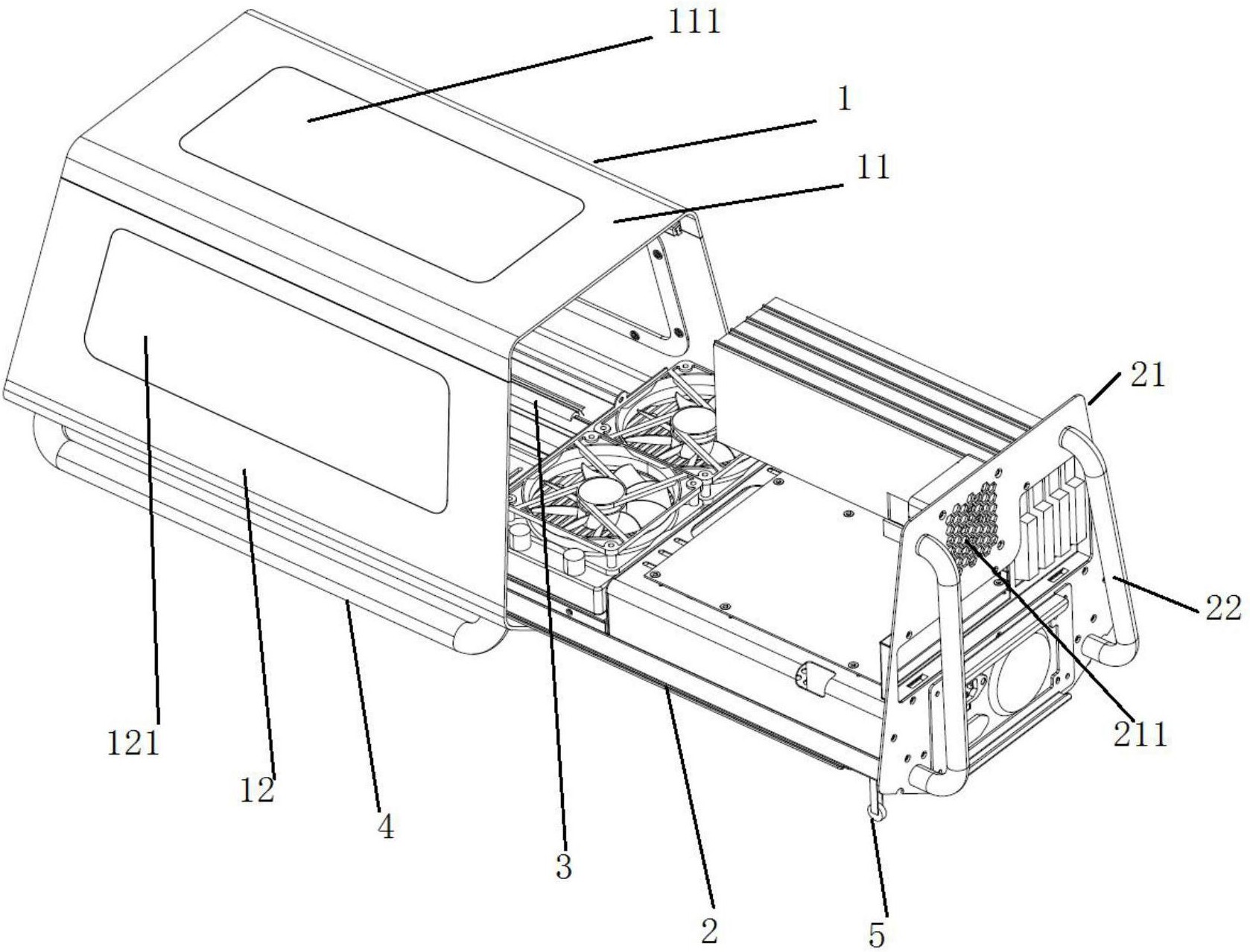 本实用新型提供一种抽拉式机箱,属于电脑主机结构领域。本实用新型包括机箱外壳和舱体,所述机箱外壳上设有导轨,所述舱体的一端上设有能够沿导轨滑动的滑块,所述舱体能够相对所述机箱外壳滑动打开或者关闭,其中,机箱内的零部件设置在舱体与机箱外壳形成的容纳腔中,并固定在所述舱体上。本实用新型的有益效果为:可将硬件从舱体抽出,不受空间限制便于安装、维修,同时有利于散热。