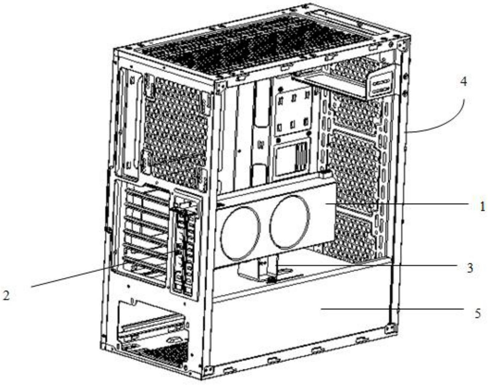本实用新型公开一种显卡固定装置,包括PCI挡板和固定模块,显卡的一端与PCI挡板连接,显卡的另一端与固定模块连接,所述PCI挡板设在机箱主体的外壳一侧,所述固定模块设置在机箱主体的内部并且可沿着显卡的长度方向移动。本实用新型通过采用可在电源包仓上左右移动的固定模块,达到对不同型号的显卡竖插进行固定的效果;由于固定模块与PCI挡板共同撑起显卡,显卡下方金手指悬空,因此可以匹配任何第三方显卡排线。