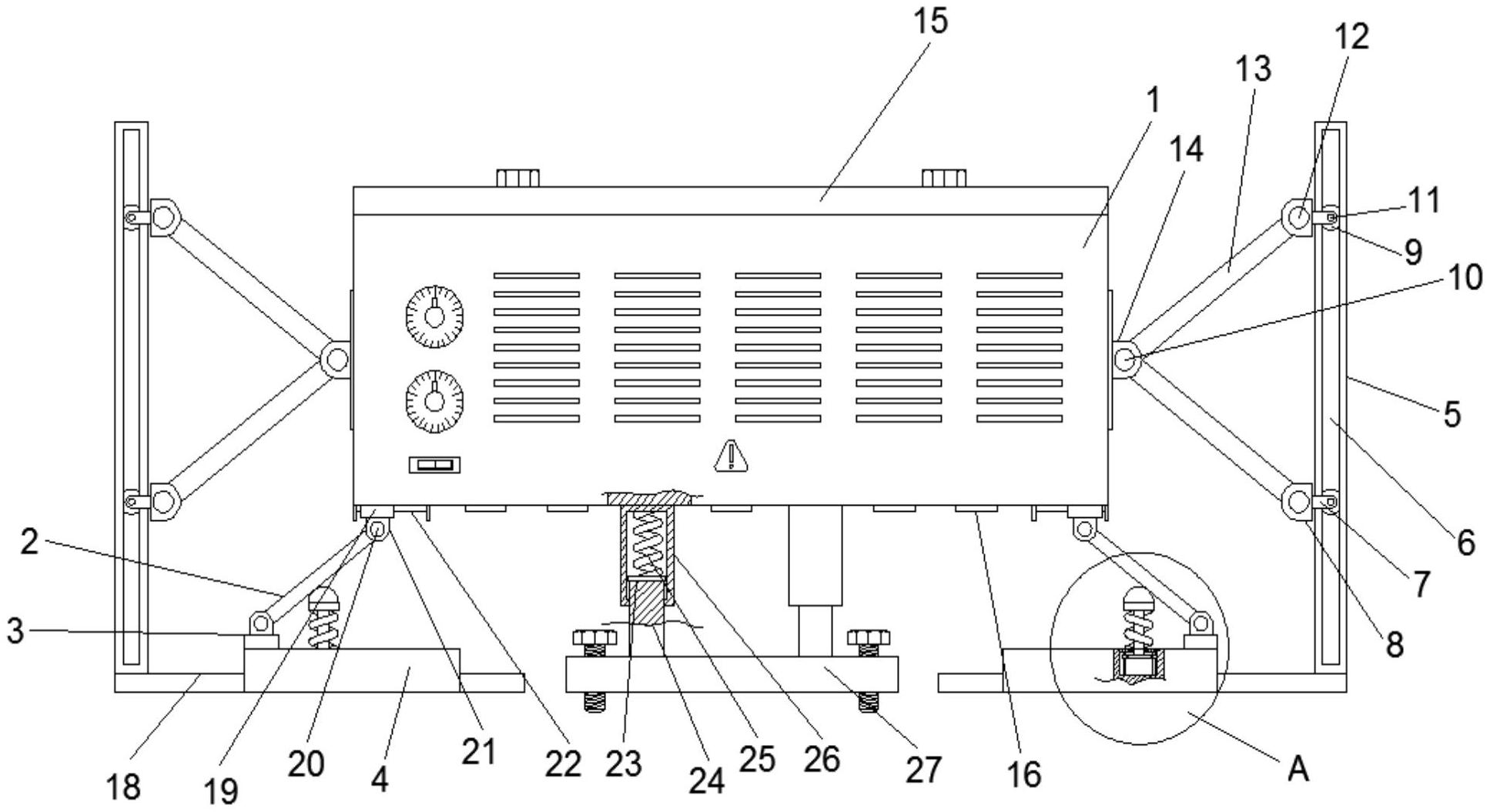 本实用新型公开了一种结构稳定的暖风机,支撑杆的另一端活动连接在第二固定轴的外侧壁,第二安装座固定安装在安装板的上侧壁,安装板的上侧壁开设有安装孔,安装孔的内侧壁固定安装有卡接板,卡接板的内腔插接有滑杆,滑杆贯穿于卡接板的内腔并延伸至外部,滑杆的下侧壁固定安装有限位板,通过第一弹簧增加垫块的缓冲力,从而提高了垫块的缓冲力,进而提高了支撑杆的稳定性,使得两个支撑杆稳定的对暖风机主体进行支撑,保证了暖风机主体的稳定性,减小了暖风机工作时候的晃动,保证暖风机可以稳定的进行工作,通过滑杆下表面的限位板防止滑杆从与卡接板的贯穿孔内滑出,从而保证了暖风机结构的稳定性。
